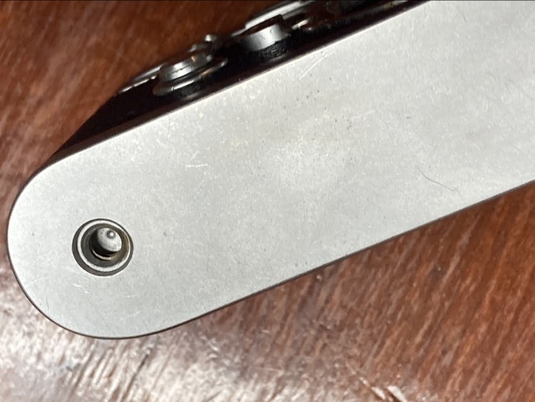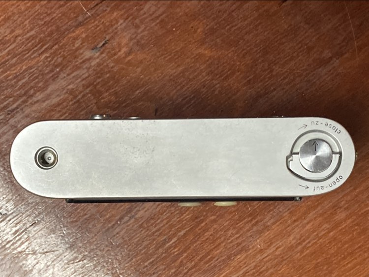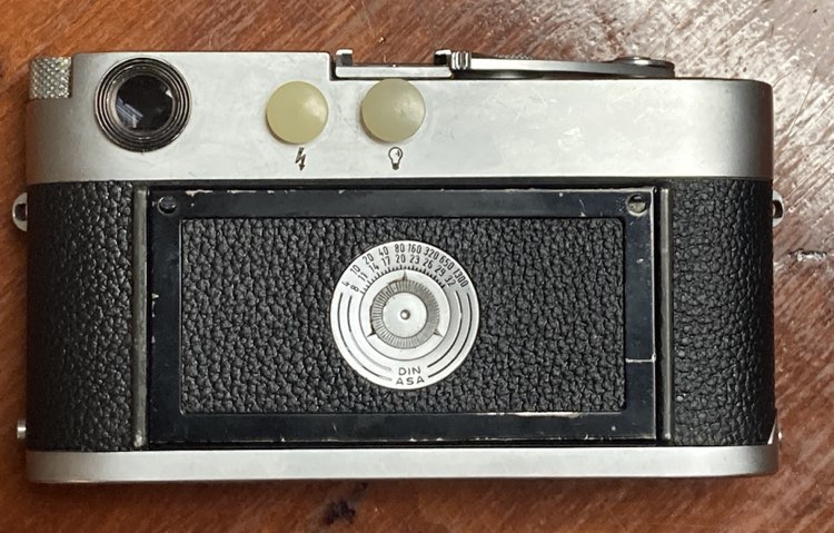 Camera works well with shutter just CLA'd. Rangefinder accurate - viewfinder clean and clear. Camera shows good honest use. No major dings or dents, just one little tiny pinprick on front far left at 11 oclock, otherwise just brushmarks. The little metal film reminder disc on the back door is missing which is common. Note a little red leica dot on curtain.