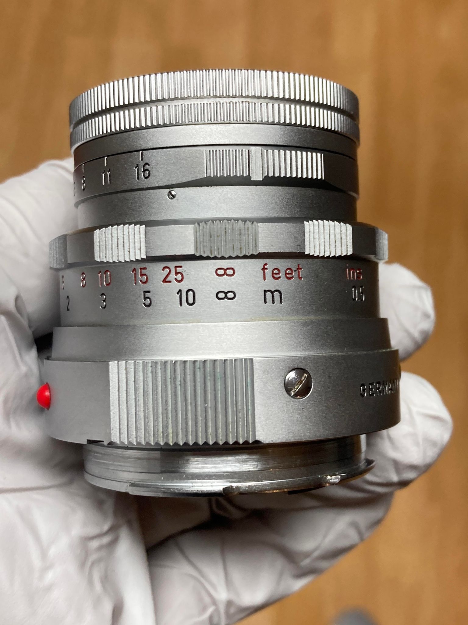Note: CLA’d. Lubricated focus helical. Cleaned and lubricated aperture ring. Cleaned aperture blades. Cleaned optics and removed haze inside. The 3rd element has coating aging signs, beyond cleaning. The lens is still a good user. Tested the lens with digital M body, the lens is in focus and produces good images.