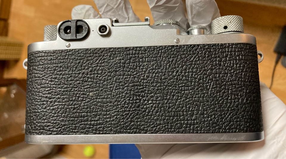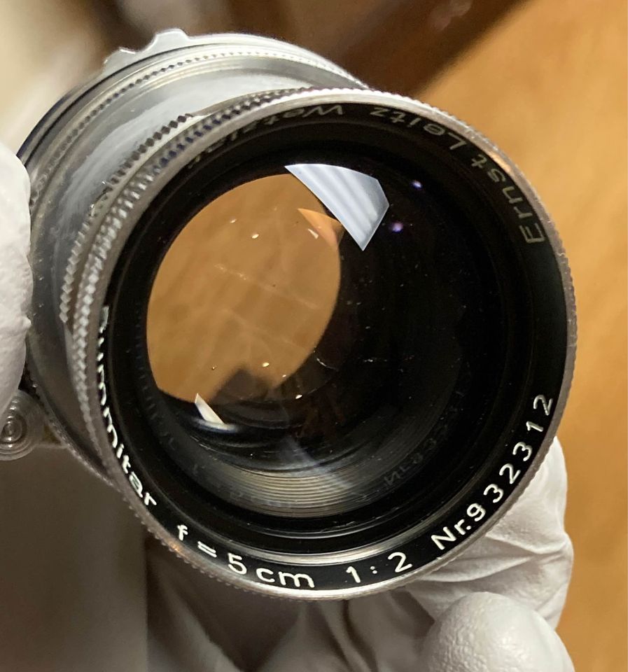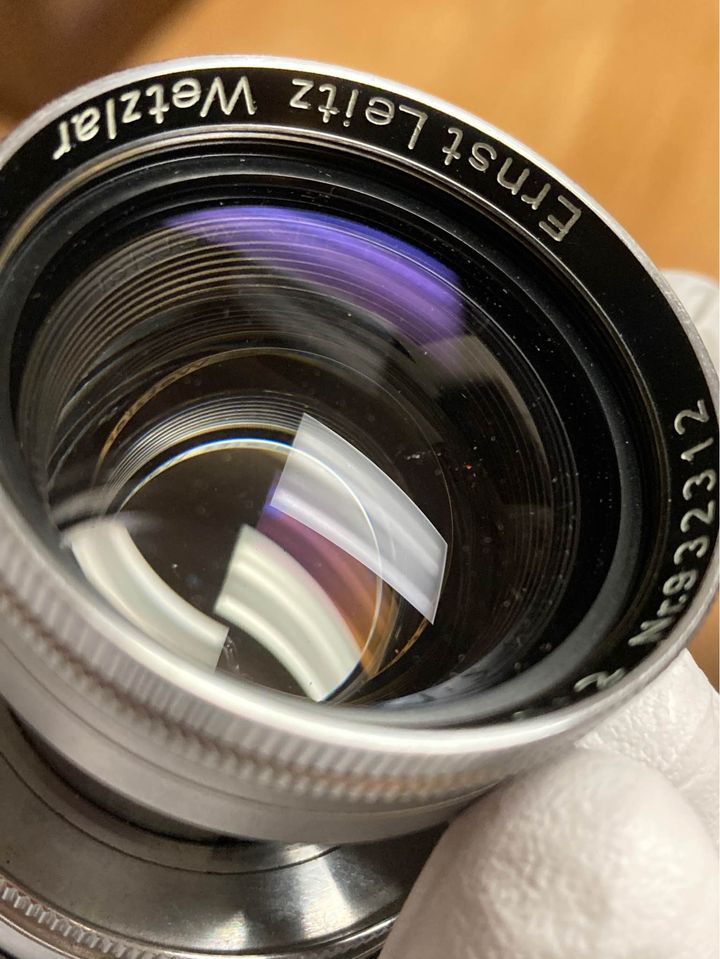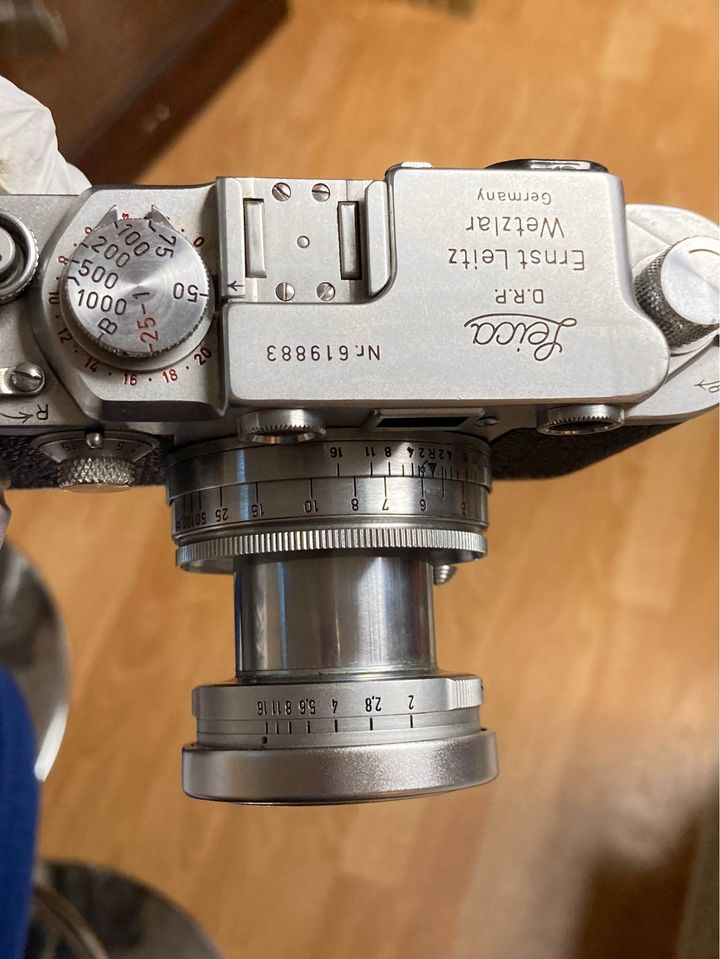 Leica IIIf Red Dial Camera from 1952 in good working order. Shutter sounds great at all speeds. Viewfinder clear. Rangefinder spot doesn't have a hard defined edge, but the two images are well defined and focus is easy. Dead accurate RF too. Curtains in great shape. Cosmetics are nice - no dings or dents...minmial wear...a nice cleaning with qtips will make this camera shine...Grades 9-/9. Leica Summitar Lens is equally nice... Clean and clear with great coatings. No haze or fungus or oil or swirly cleaning marks...smooth focus...lens cap. Lens shoots great - see test images taken at f/2 and f/4. Great Bokeh.