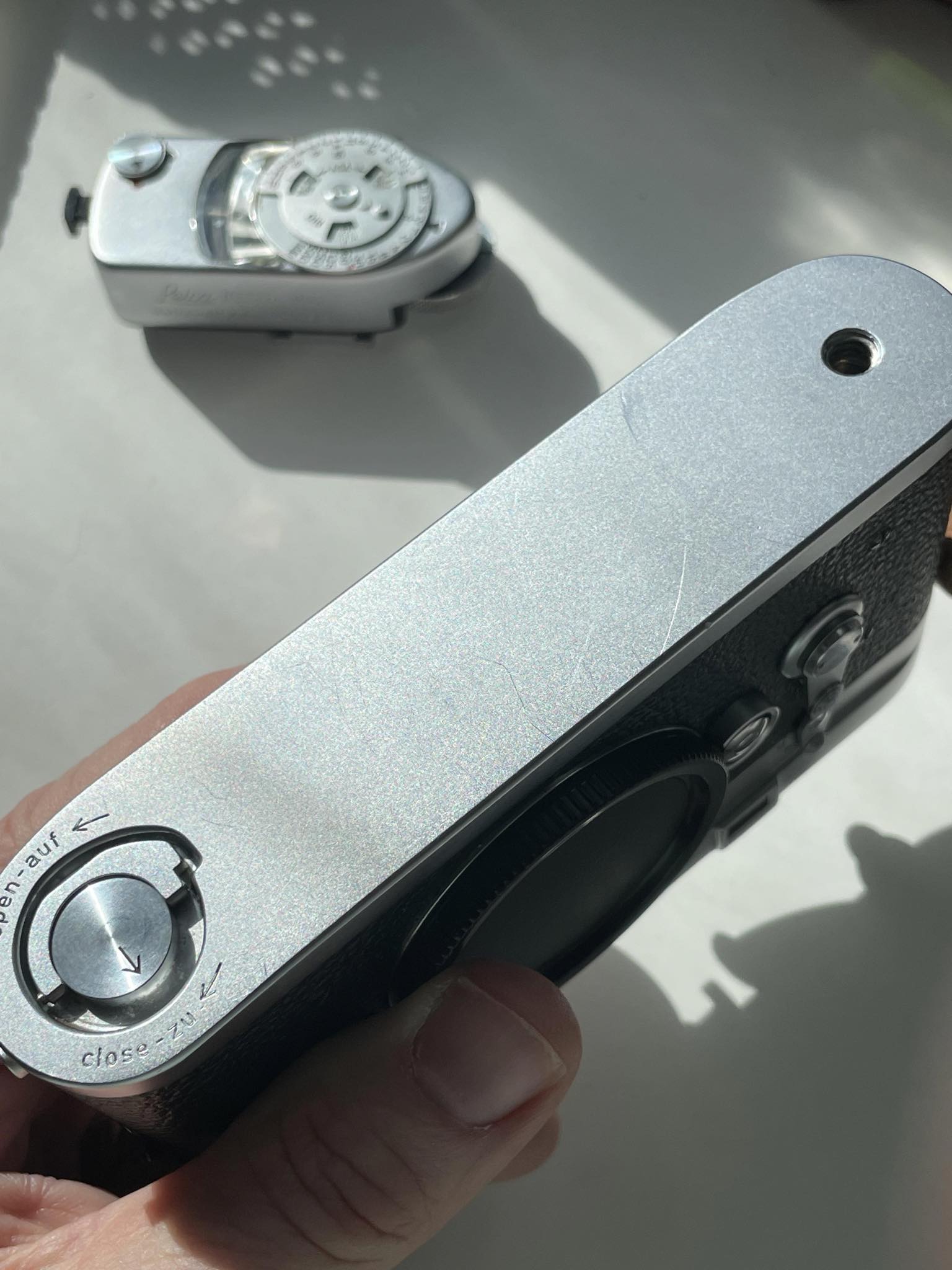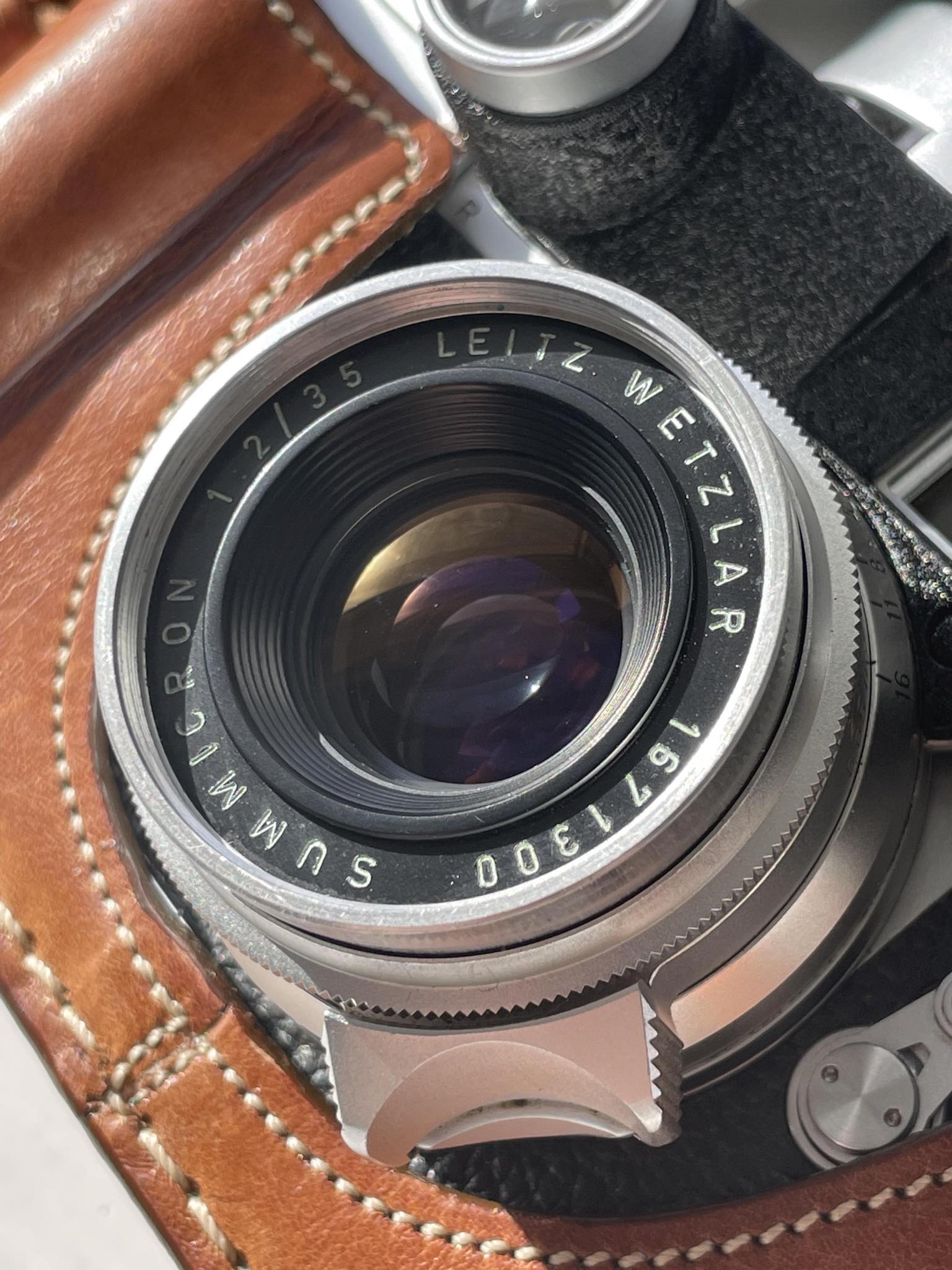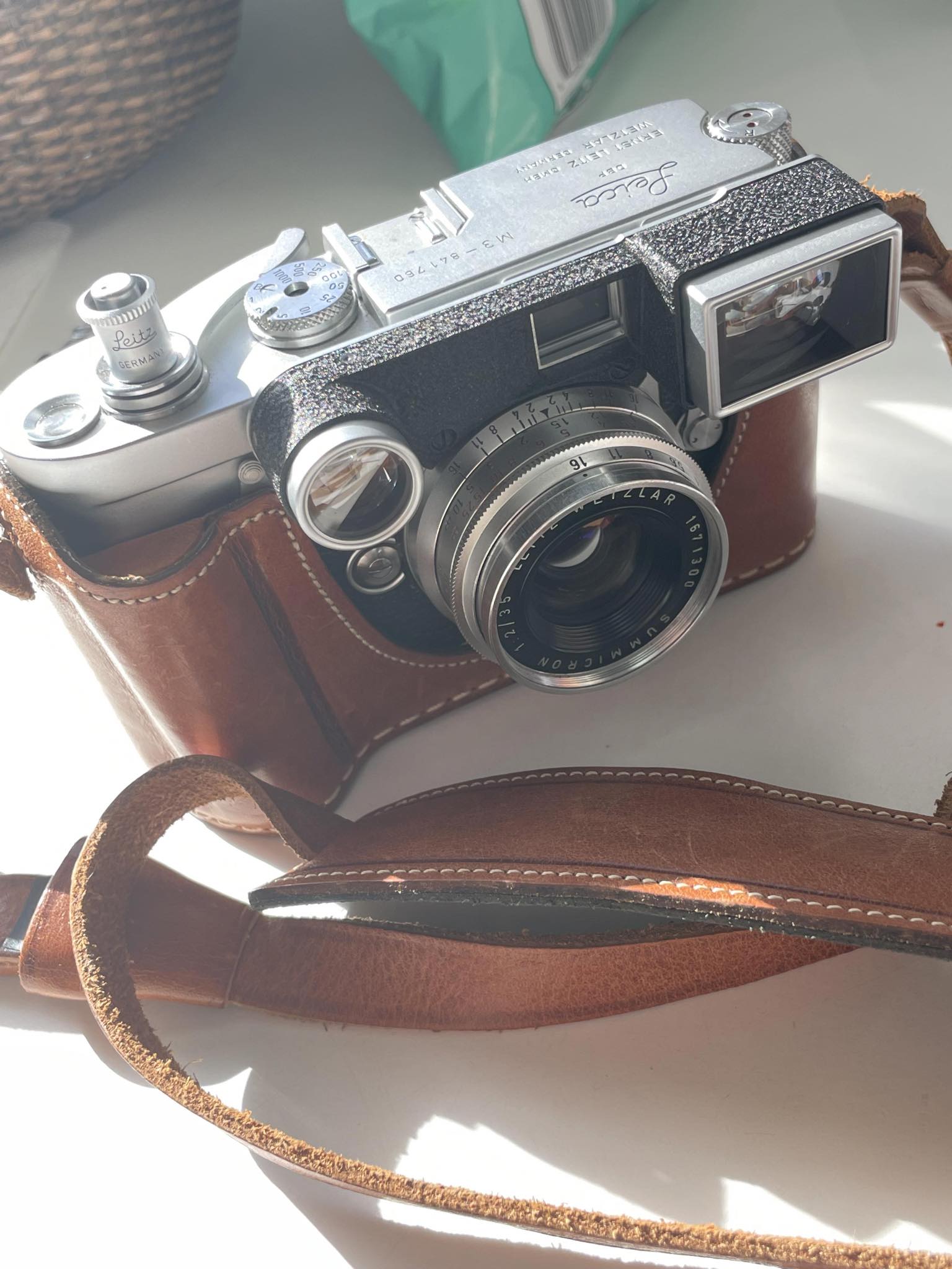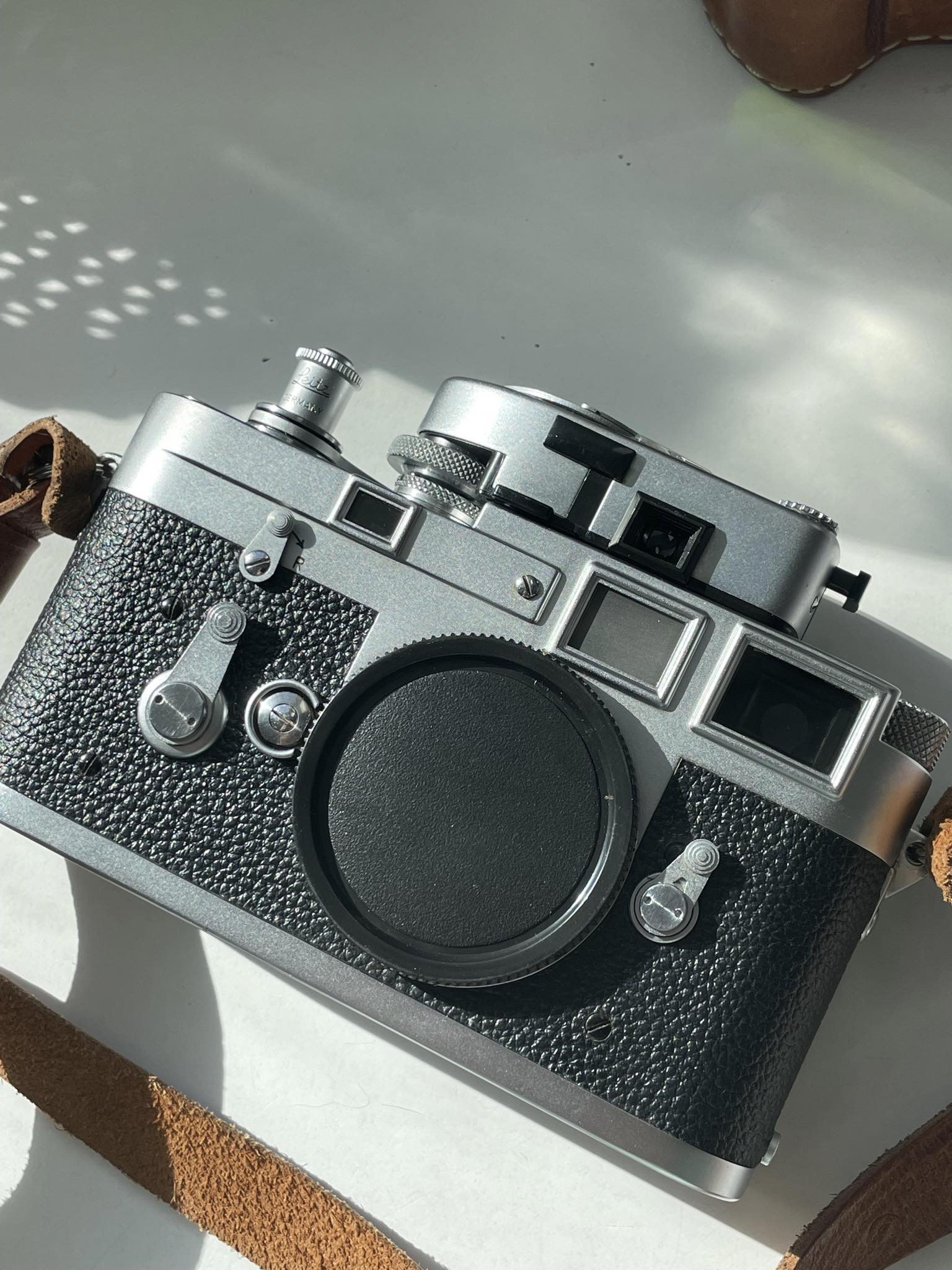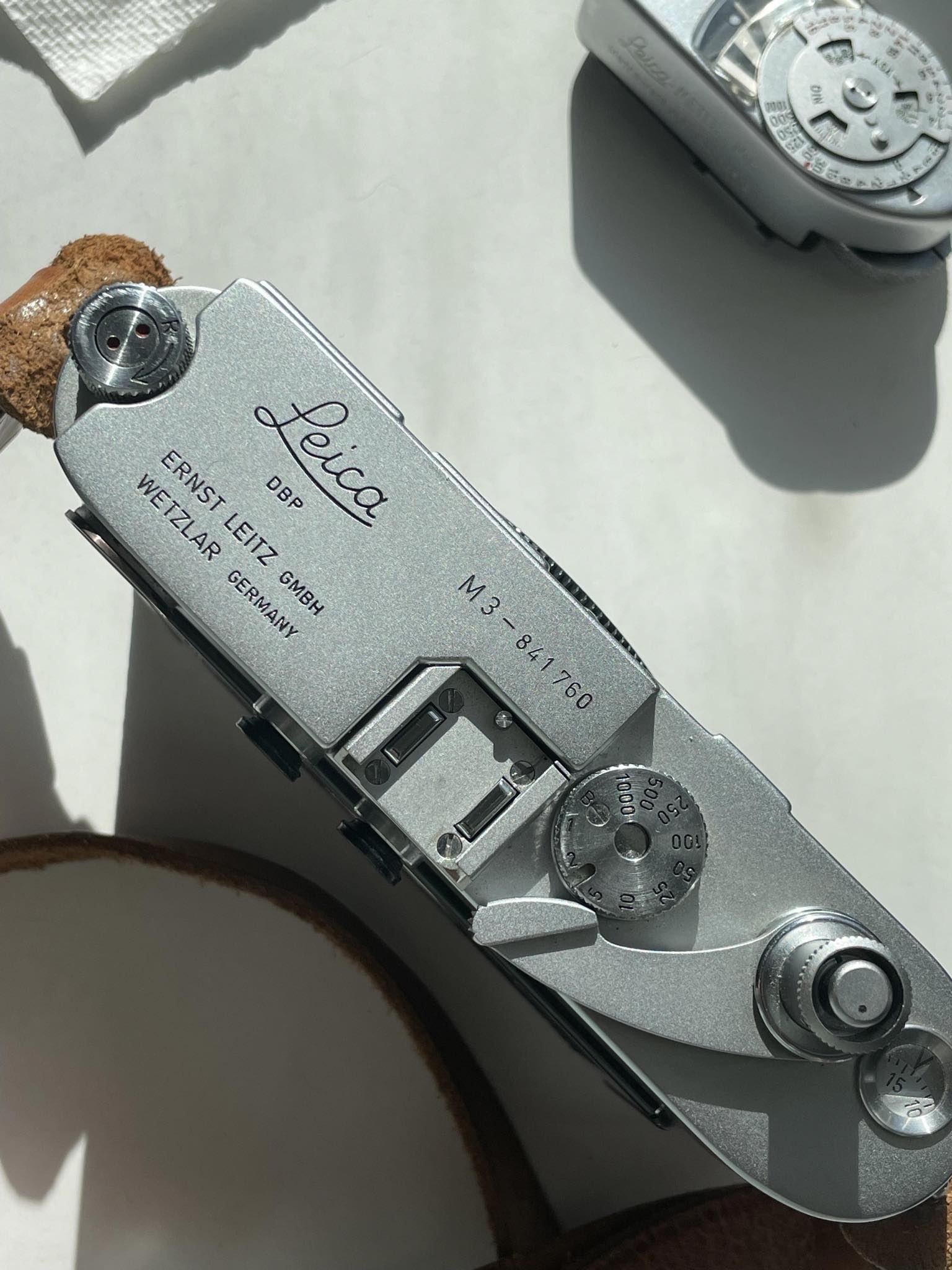 1. Leica M3 double stroke: CLA in 2023. Recovered and works beautifully. Body has some of the typical scuffs here and there, but over all a very nice model. Also included is a working Leica MR meter. Works great. Luigi / Leicatime premium leather case and strap also included. These are top of the line. Also has a quick load spool. Topping it all off is a lovely Oztno shutter release.