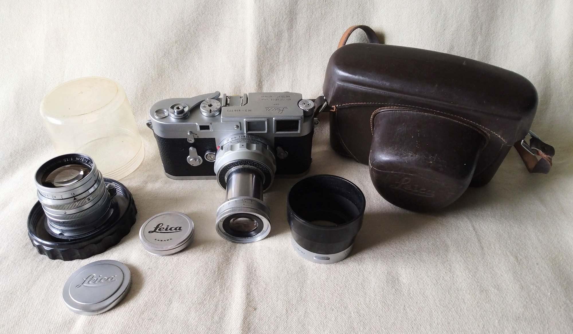 Leica M3 Double-Stroke (DS) 35mm rangefinder, dates from 1956. Includes Summarit 5cm and Elmar 9cm lenses, leather case. Slight chip on eyepiece; fairly sharp edges.