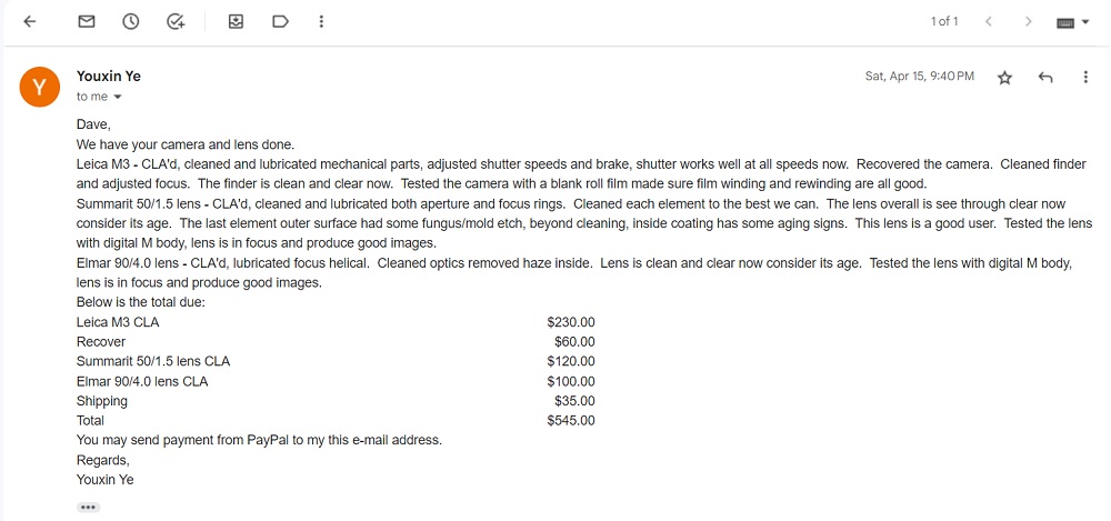 Had a CLA of body and lenses by Youxin Ye this spring (see last photo for screen grab of his comments).