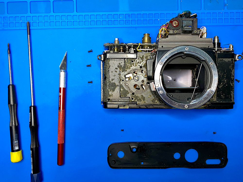 So all I can do is remove the mirror box and look at the problem on site. Then I can also assess how much oil the shortcut has distributed where. In any case, it is mixed with Zippo and is sitting on the shutter blades. But that can be cleaned.