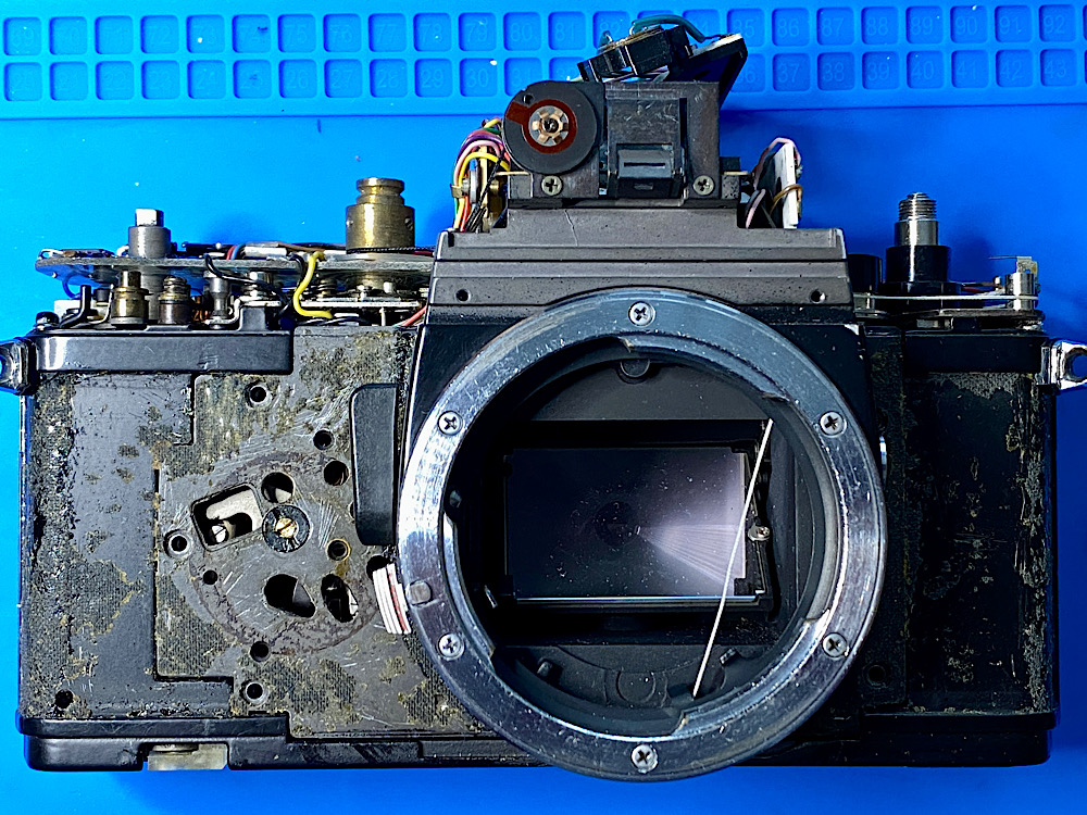 I did take out the mirror box but did not disassemble the mechanism (like they show on the Nikon f2 videos), I merely placed fine lubricant at the rotating parts and grease where levers touched.