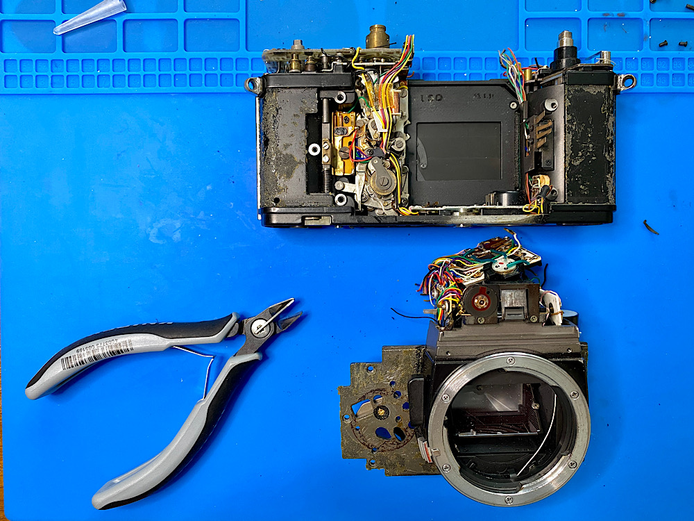 I have a nice R3 here, in which the electronics are obviously still working properly (lucky!), but the mechanism in the mirror box seems to be resinified. The mirror only works as it should when I place the camera on the prism. Otherwise it will stop halfway