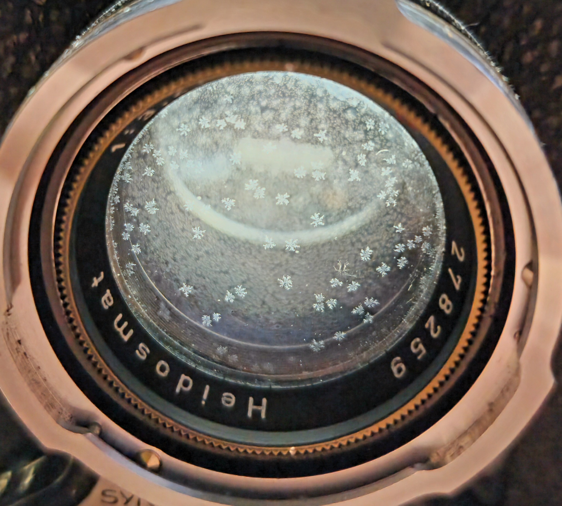 This is the viewing lens and despite how bad it looks the view is still pretty good. My search has shown it to be possibly balsam separation while others say it is fungus. Searching also says it is common on Rolleicord IV's of which I have 2. This is on both front and rear lens elements. The other 'Cord is nowhere near as bad...yet.