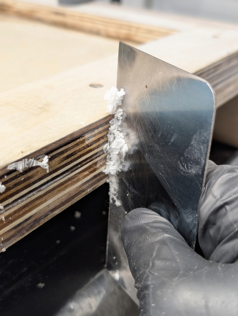 ...and I got started with coating the interfacing subframes and floor surfaces with some heavily aerated epoxy. Much like the routing, there's also not much footage from this part; this time, my third arm was busy readjusting the 3M respirator that I was attempting to wear,because I don't