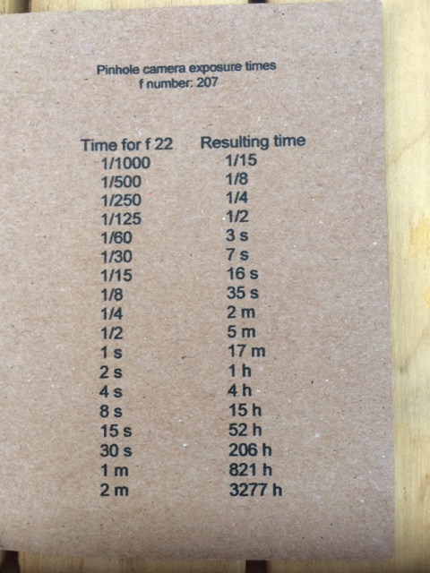 I have tables printed on to cards that have columns for the recommended exposure for f/22, the resulting exposure for my pinole (f/207) and the necessary in field exposure (to take into account reciprocity failure). The tables were generated in a pinhole related Windows program.