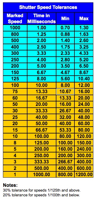 You can extrapolate from here by simply multiplying the denominator of the previous set by 2. As you can see, the older scale 1/5, 1/10, 1/25... is included in this sequence. If you need real accuracy, you choose the most appropriate shutter speed and make the smaller adjustments with the aperture. Chrome film benefits from trying to be accurate the the third stop, negative film is much more forgiving, but err on the side of overexposure, as mentioned above.
