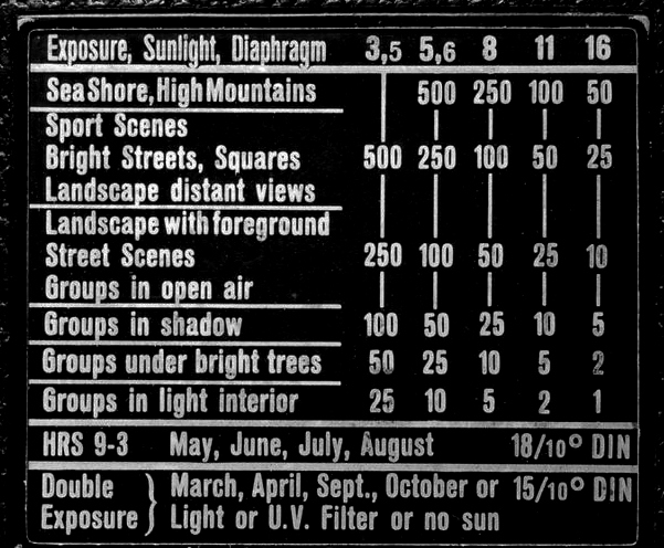 Rolleiflex tlr's had a plate detailing sunny-16 exposure times by time of day and year: