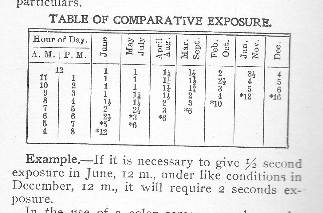 I‘ve understood the „1“ in the table to be the standard factor, and the other numbers to be exposure compensation factors. But reading the example text, they do mention 1/2 sec exposure, so it seems to be really slow film indeed. Anybody knows what the normal ASA was at 1890? :smile: