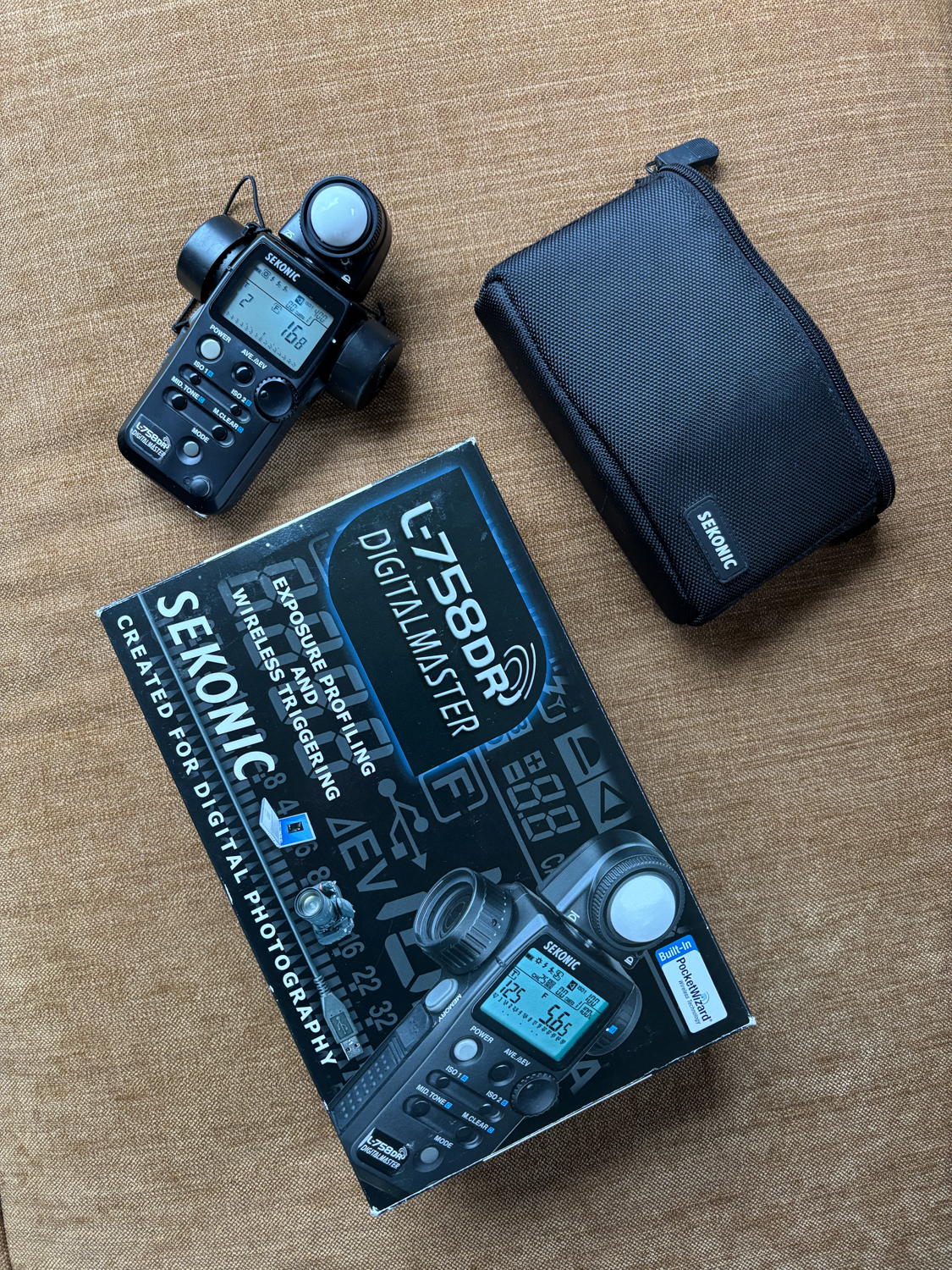 1. Sekonic L-758DR. Comes with original box, lanyard, lens covers, soft case, and CDs and documentation, as well as pocket wizard. Cosmetically in excellent condition. The light meter is about 2/3 stop off (underexposure), but it's pretty consistent across the range. $225 net to me.