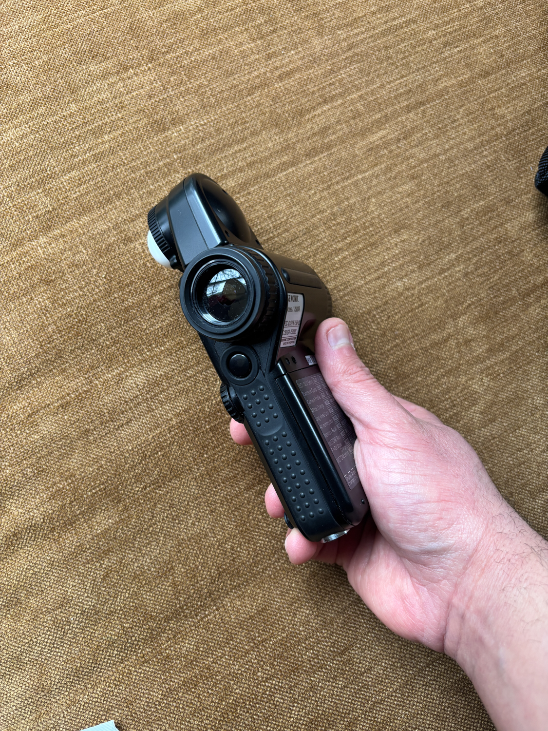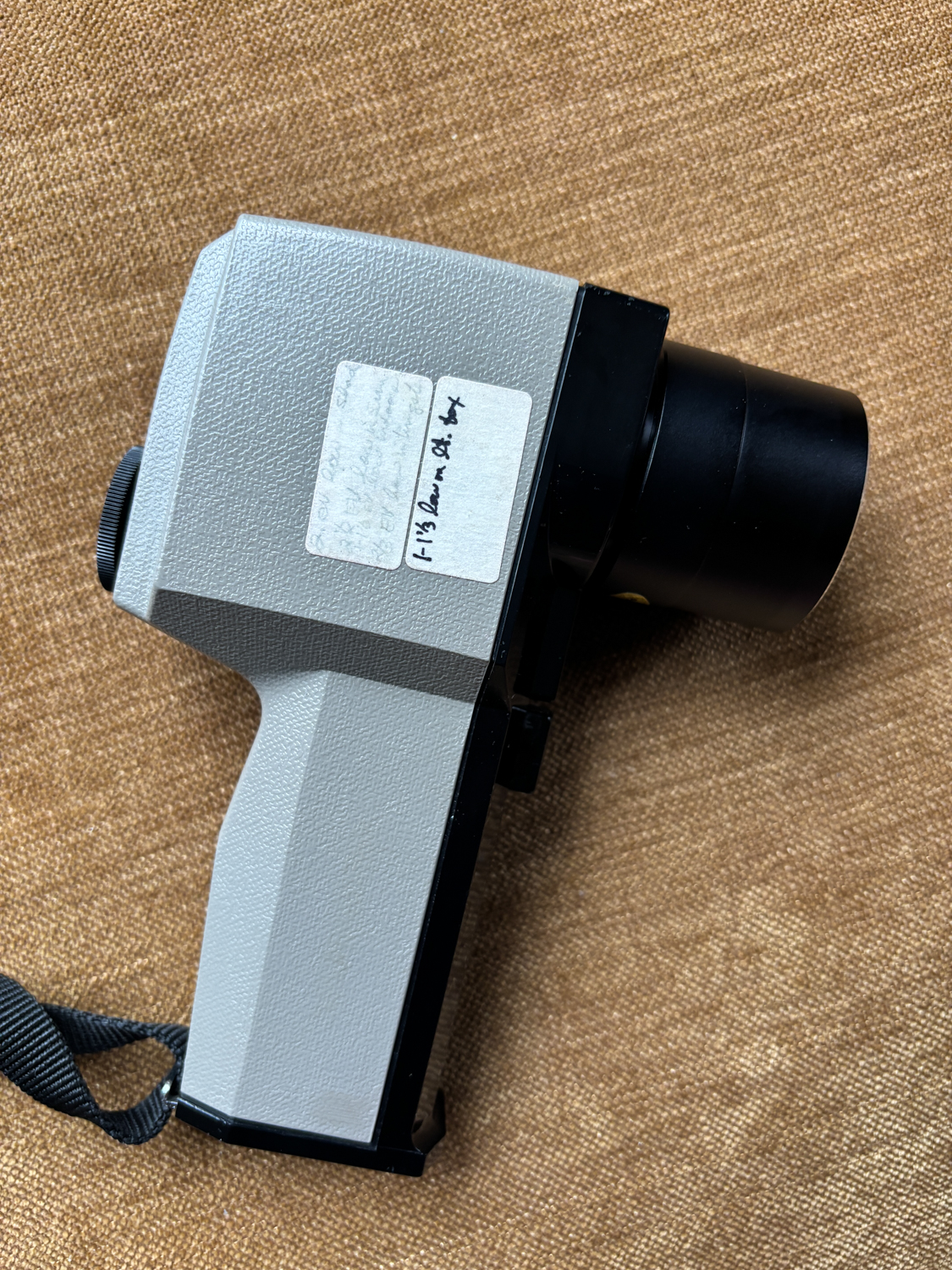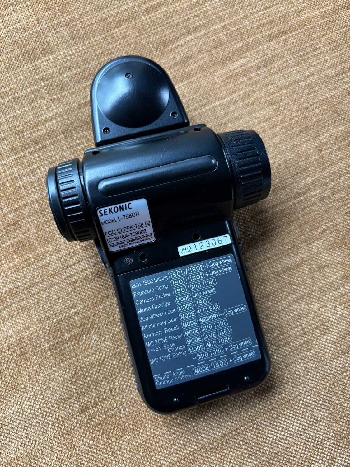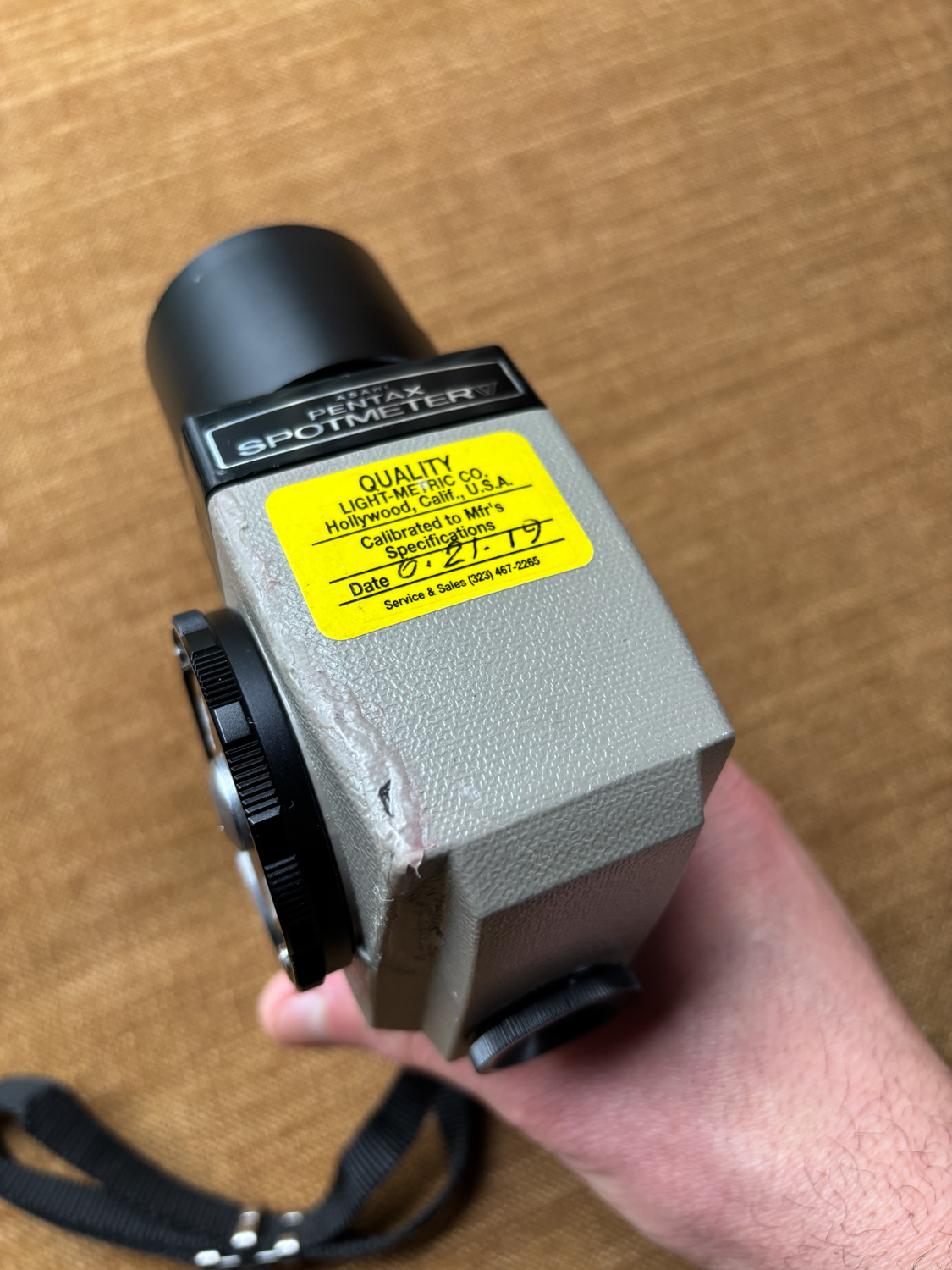 2. Pentax Spotmeter V. Comes with original manual and leather case, as well has lanyard. It was serviced by Quality Light Metric in 2019 or so. This one really stings. I dropped it on the sidewalk shortly after that, and the casing cracked. I glued it back together and the casing hasn't been an issue at all since then. The exposures are spot on. I need to mention however, that about 10% of the time the needle won't move at all, but if you press the exposure button a few times, it eventually gives the right EV reading. $25 net to me.