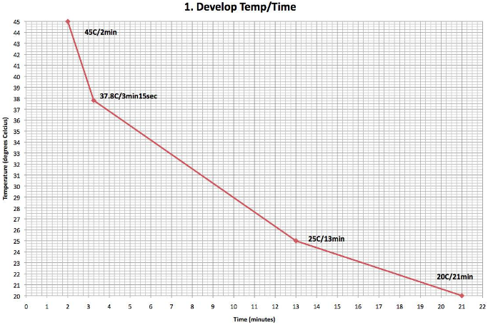 Part of the complication is that the activity of certain ingredients in a developer formula might respond to significant temp change differently than other ingredients. I've found that to be particularly the case with hydroquinone. Therefore, if you want to explore the consistency of linearity based upon a time change per se, it's best to stick to a single standardized temperature.