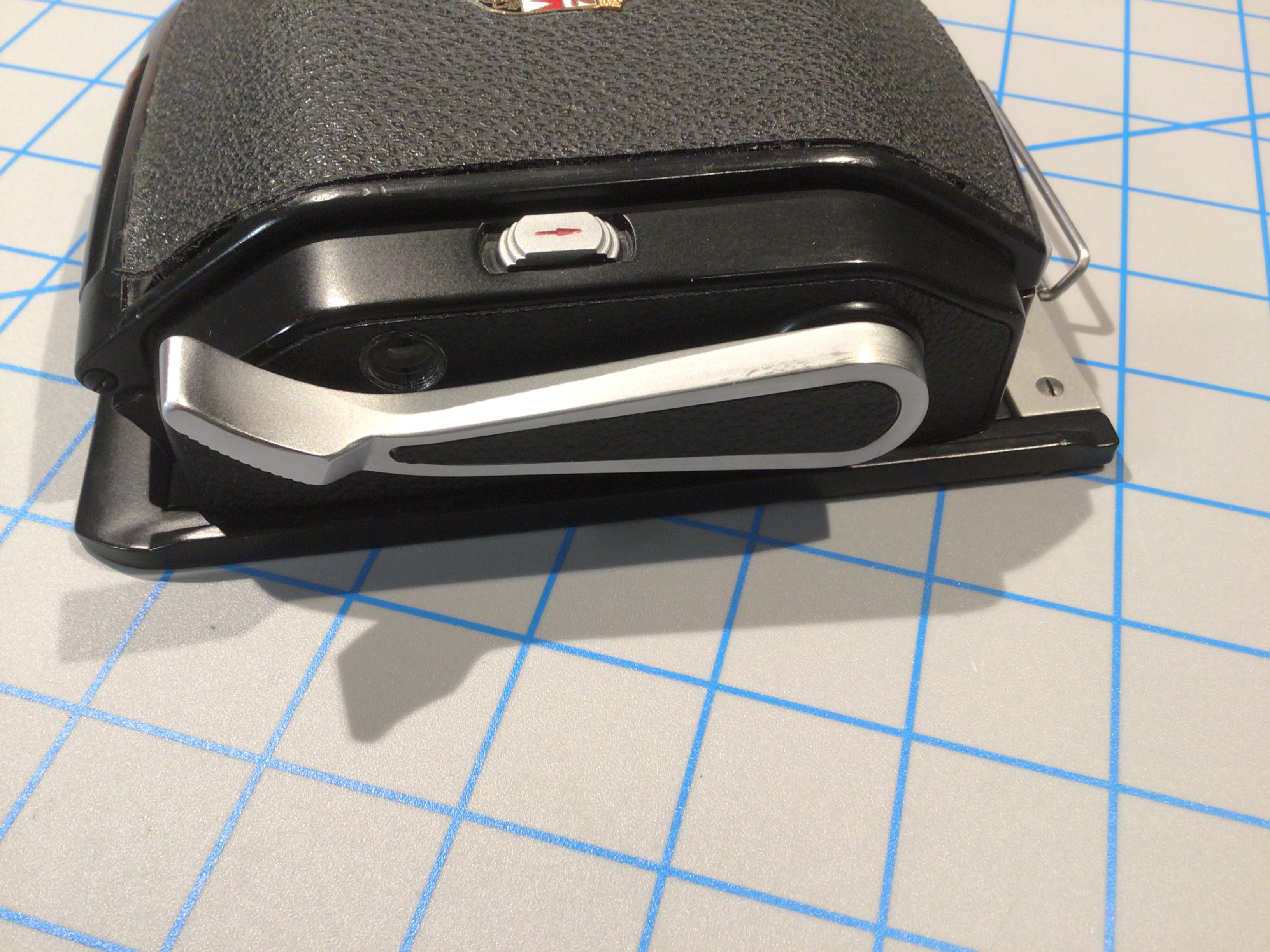 This Linhof 6x12 roll film back is in good condition. It shows minor signs of use but is fully functional.