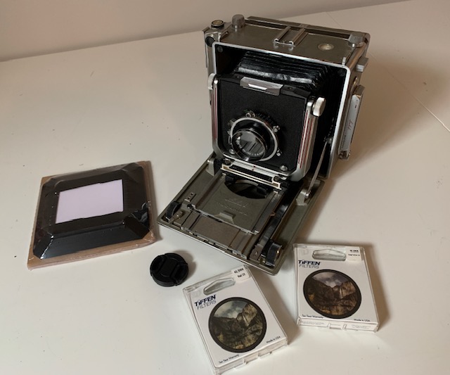 Selling my Linhof Super TECHNIKA IV with Fujinon WS 150/f6.3 lens in Seiko shutter. Glass in fine shape and shutter fires on all speeds and to my ear they sound fine. Uses the newer Linhof style lensboards size 96 x 98mm. Includes a new set of bellows from Keith at Custom Bellows in England - existing bellows work but they will need changing at some point. There is an excellent video on YouTube that explains how to do this. Bellows from Custom Bellows cost 165UK Pounds and Custom Bellows makes them for Linhof. The body is in good shape and all functions work but could probably benefit from a gentle clean. Camera has Linhof Graflok back. Leather is marked but it is only cosmetic. Comes with Tiffen deep yellow and red 40.5 mm filters. A good kit which I just do not use any more.