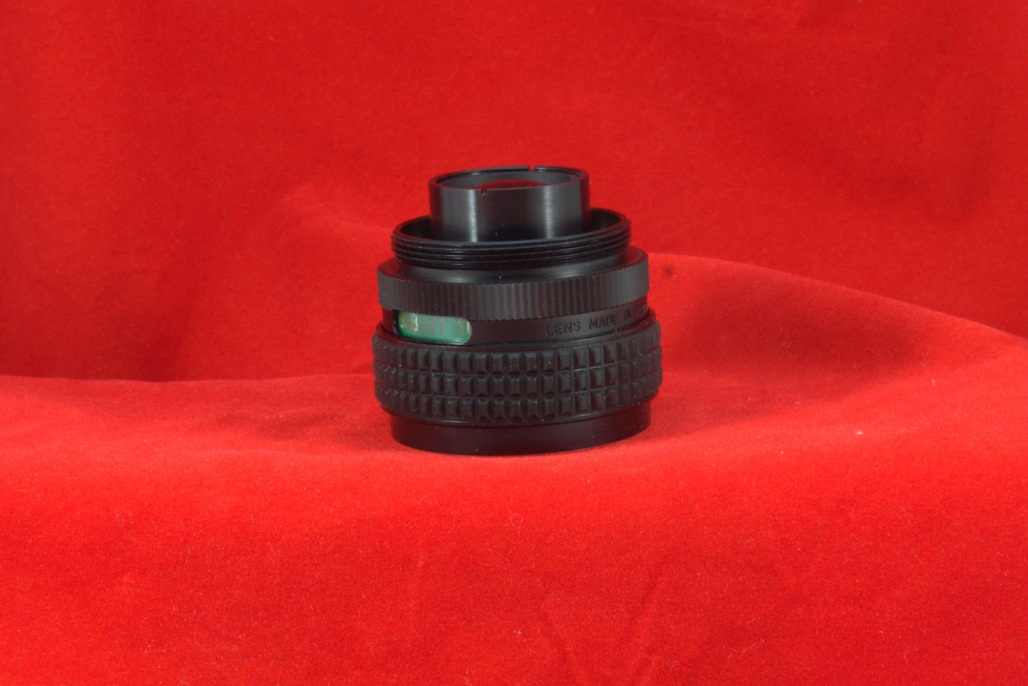 It is uncoated and optically is a “stinker.” The metal parts are nicely finished. The aperture has no detent mechanism. The contrast is noticeably low when merely viewing through the lens. I cannot resolve grain when viewing the projection with a 25X Microsight (8.5” wide projection of 6 x 6 cm T-Max 100 negative.