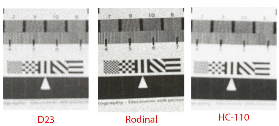 As expected, Rodinal is the grainiest of the three but with this film and enlargement it's only really visible if you look carefully at the test resolution target. Second comes D23, while HC-110 has the finest grain.