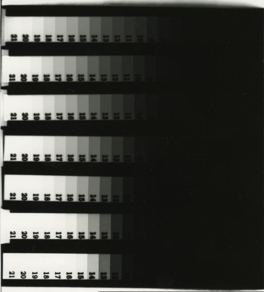 Perhaps the areas of zone convergence (adjacent zones printing the same density) were not so easy to detect because the flat areas only contained portions of a single zone (less than one stop in length) or, because there were more than 8 zones of negative density in the print, the effects of a complete adjacent zone convergence were more difficult to detect.