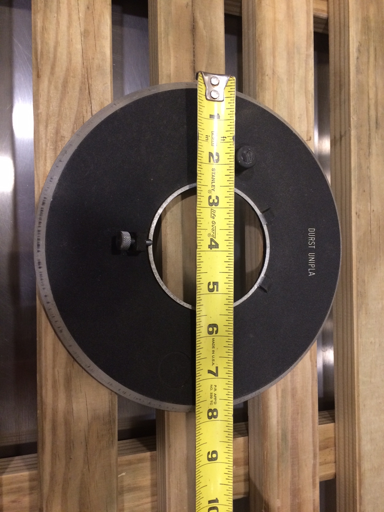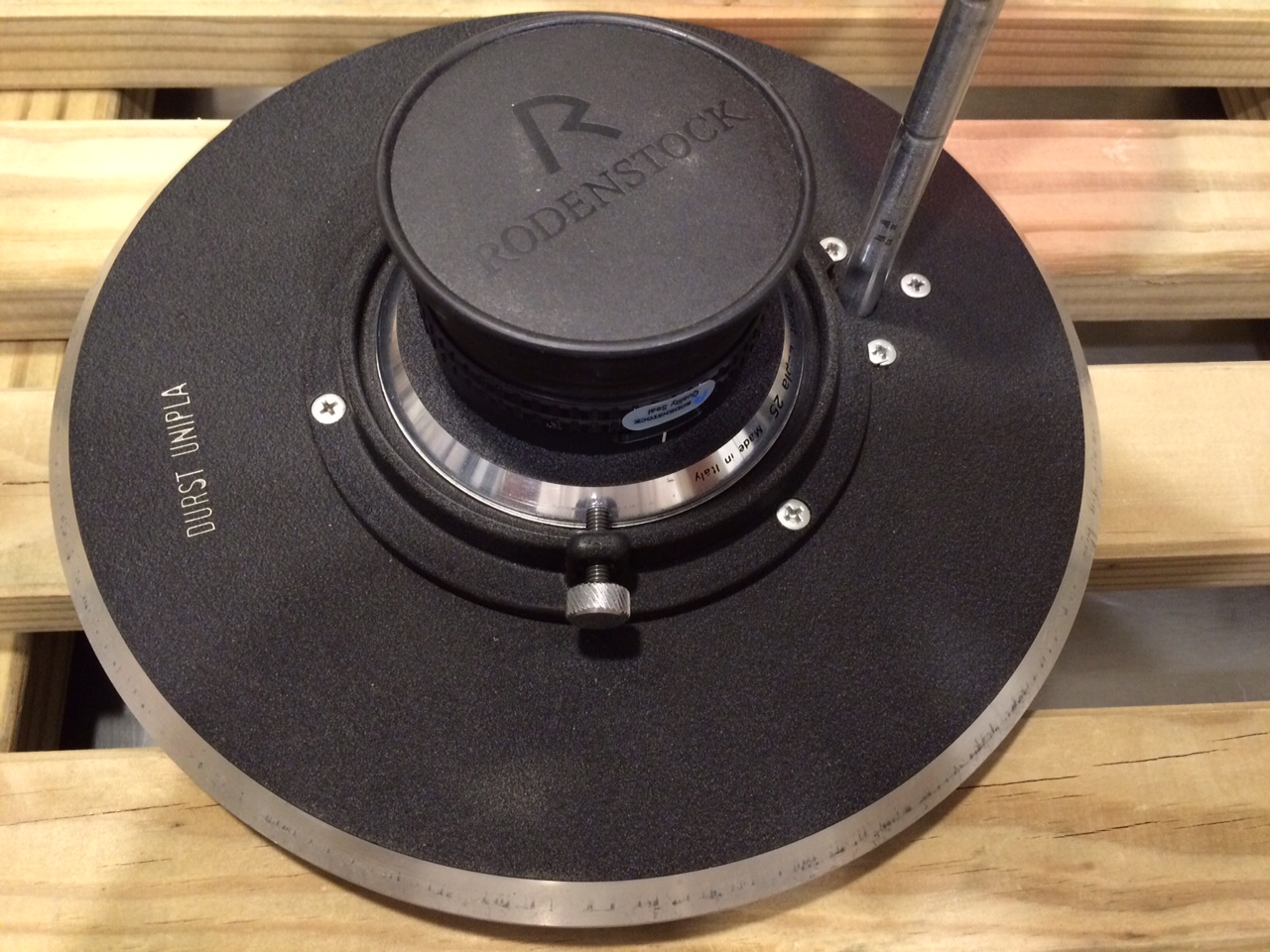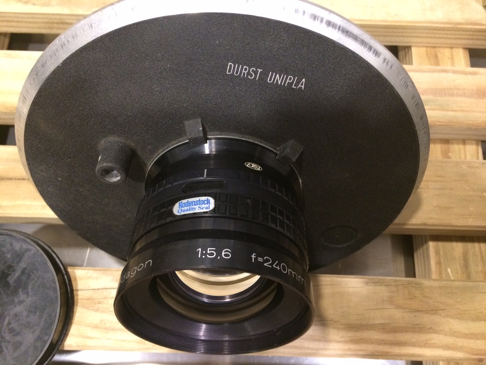 Here is a photo of an Unipla board for the Durst 184 enlargers. I got mine on the 'Bay for under $40. The Unipla holds one lens mounted on a Lapla board, the turret (which you have) holds 3 lenses each on their own Lapla board. This Unipla has the lugs to take the smaller Lapla boards. You can also use a flat Unipla and mount the retaining ring for the lens on it. The second photo shows a Lapla 39 on the Unipla onto which you would screw an enlarging lens with a 39 mm (Leica) mounting thread. You can find Laplas on the 'Bay-there are two Lapla 39's right now; one for under $20. The third photo shows a 240 Rodagon with a custom Lapla board on the Unipla. SKG can make the custom board for the 240 (around $165 give or take), or you might find one already made. If you don't want to wait and you've got bucks to burn, you can order a Lapla Extend II from Durst Pro USA for $256, or a used Unipla for $99! I have SKG do all of my custom machine work! The last photo shows the 240 Rodagon with the SKG Lapla board (pretty much the same as the Extend II from Durst Pro). All my lenses other than the ones that require a recessed board are mounted on Lapla boards. That way I can use them on either the Durst or the Devere (on my adaptor board)-see earlier post and photos. Hope that explains it, if not, pm me.Can someone tell me the size (diameter) for a Durst 184 lens board ?