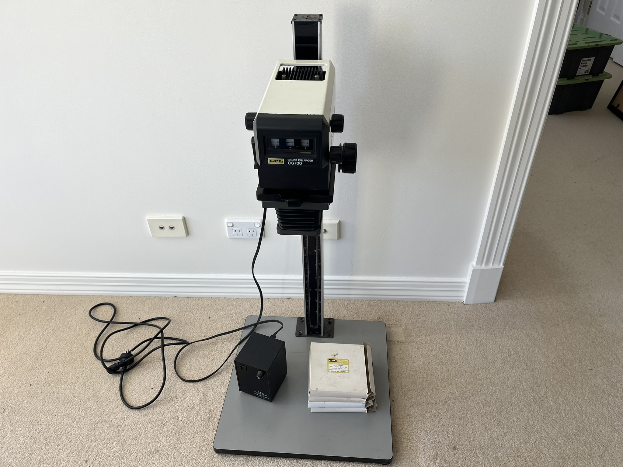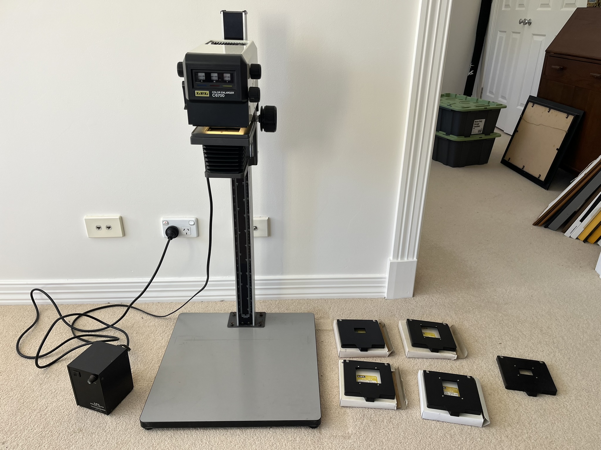 Hi there, for sale is a LPL 67 enlarger. Includes Colour Head with Transformer, Baseboard, Column. x5 negative carriers (35mm neg, 35mm slide, 6x4.5, 6x6 and 6x7. Good condition, works fine. Been in the family for years, I'm into 4x5 so this isn't what I need. Sad to see it go
