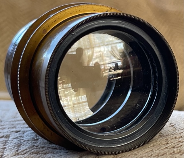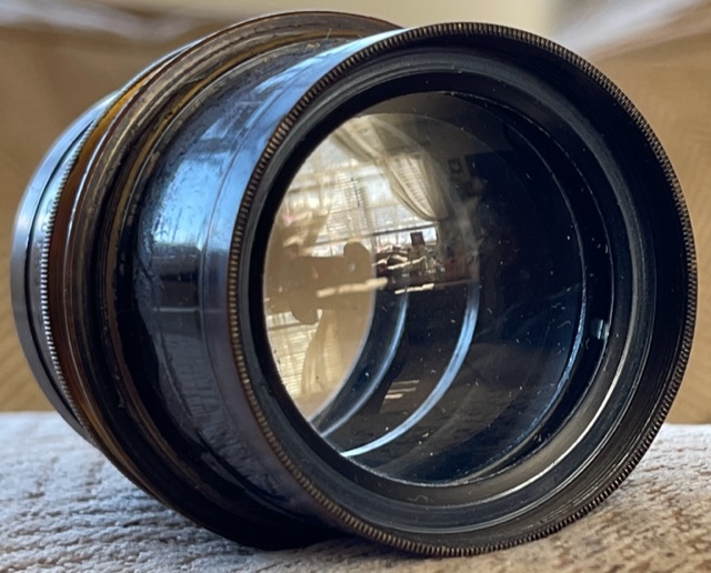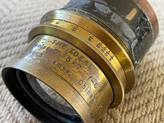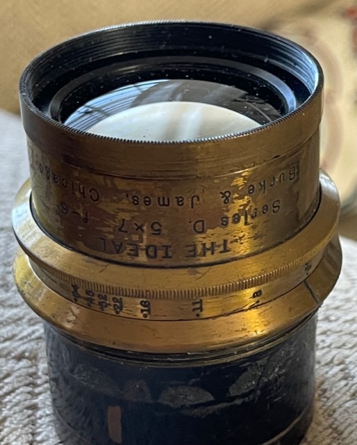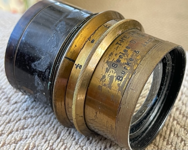 Next is a Burke & James labeled version of the popular 8 3/4" Wollensak 5X7 Group and Portrait Versar. Glass is lovely on this but aperture is gone so make it your "Go To" portrait lens for 4X5. f6 Ultra Fast Rapid Rectilinear type. Beautiful sharp signature. $OLD