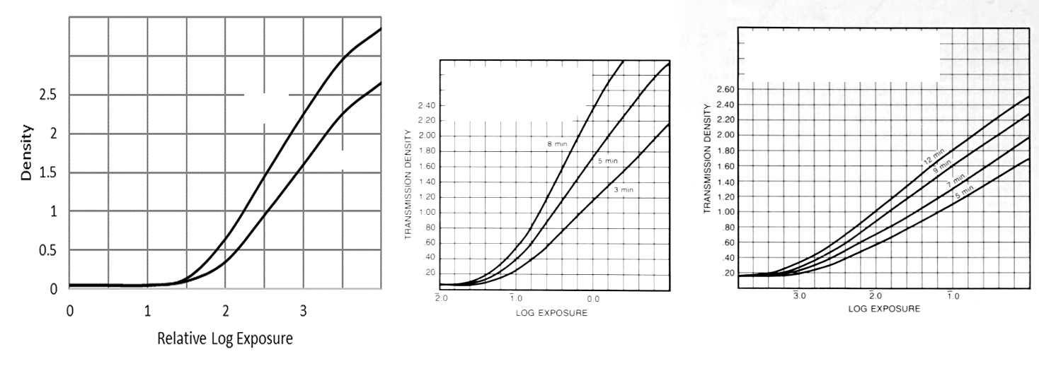 The curve on the left is Ilford Ortho Plus, the middle is a Kodak film that might be Super XX pan in DK-60a with white light exposure, and the one on the right is definitely Super XX pan in HC-110 with white light exposure. Is this to try to say I don't know my curve traces very well, Lachlan? Curves of significance are made using narrow band light, not white light.