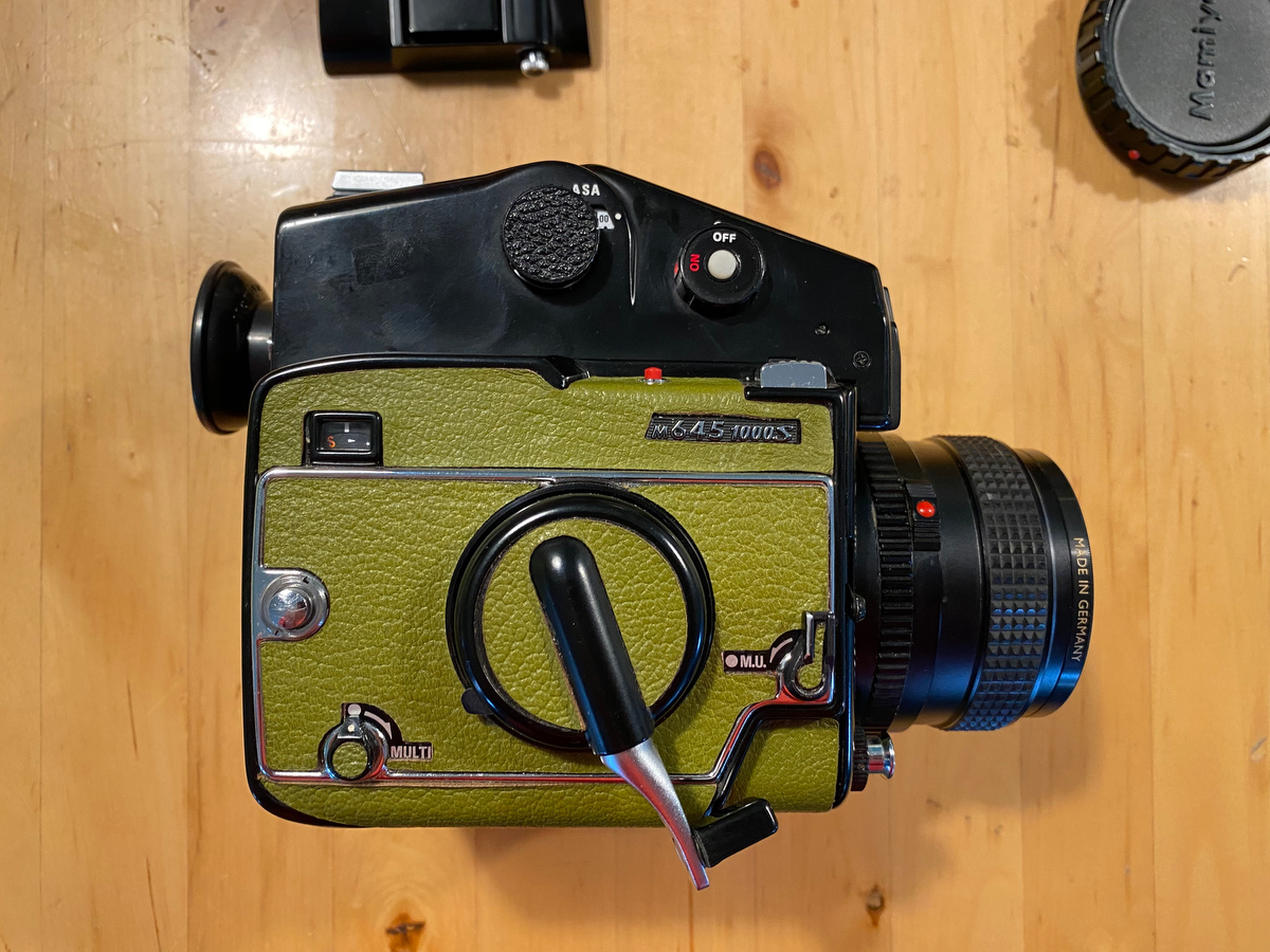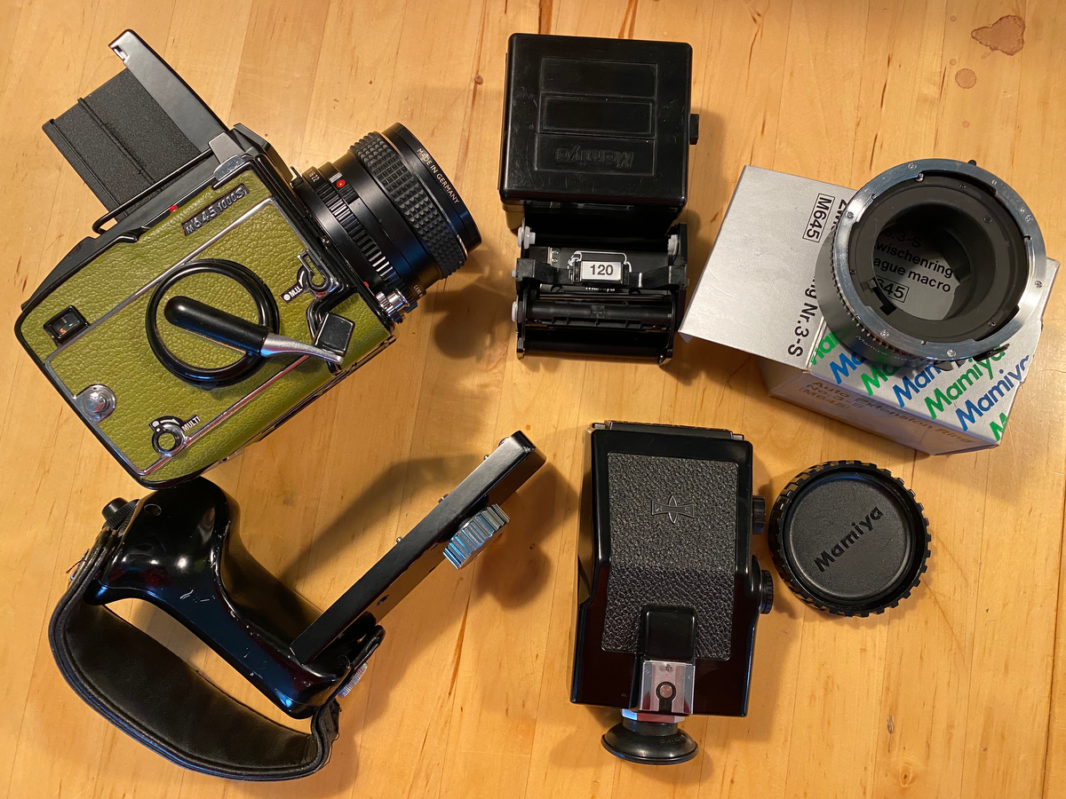 Mamiya 645 1000s body with WLF, AE prism finder, 80mm Sekor C f2.8, extra film insert & case, trigger grip, 2 focusing screens (matte & split), extension tube #3, extra battery.
