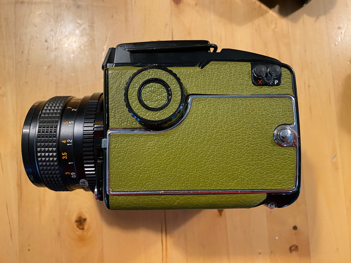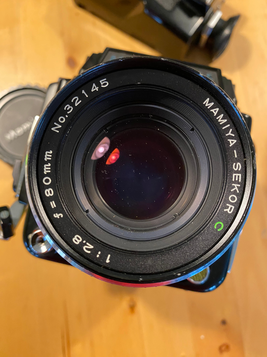 The body was overhauled in November at ICT, which included a new capacitor for the shutter timing (this is a common failure item with these cameras now). New seals. Full check-up. Works great, even frame spacing, shutter is accurate. AE prism shows a slight separation in the prism, common with pretty much every Mamiya 645 prism out there. You can barely see it in use, and the meter is spot-on with exposures.