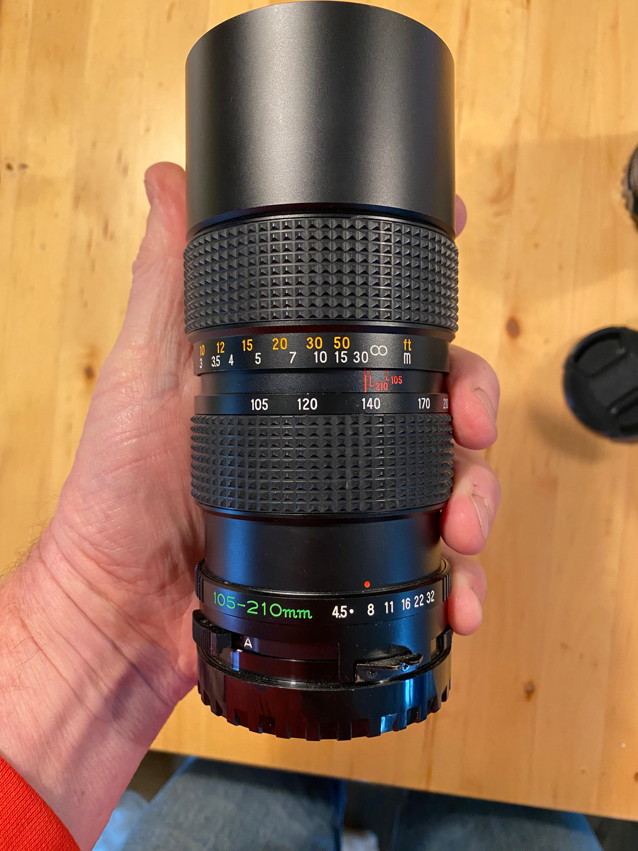 • 105-210 ULD zoom f4.5 - lightweight and useful tele-zoom, particularly for hiking and landscape. In great condition, very smooth zoom and focus. Built in lens hood. Comes with caps and UV filter. $200 net to me.