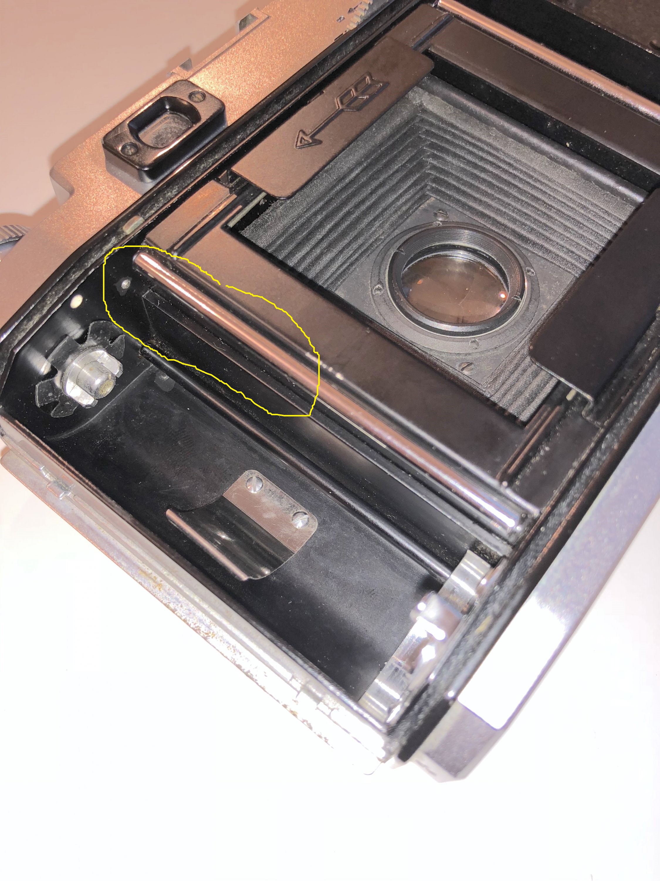 another possibility -- right under the rollers, on both sides, there is a seam -- looks as if the shielding in the film chambers is flush against the box that makes up the area where the film is exposed and the rear of the bellows is mounted...is that seam tight? Could light be leaking through there? maybe cover the seams with black tape ... it would fit under the rollers.