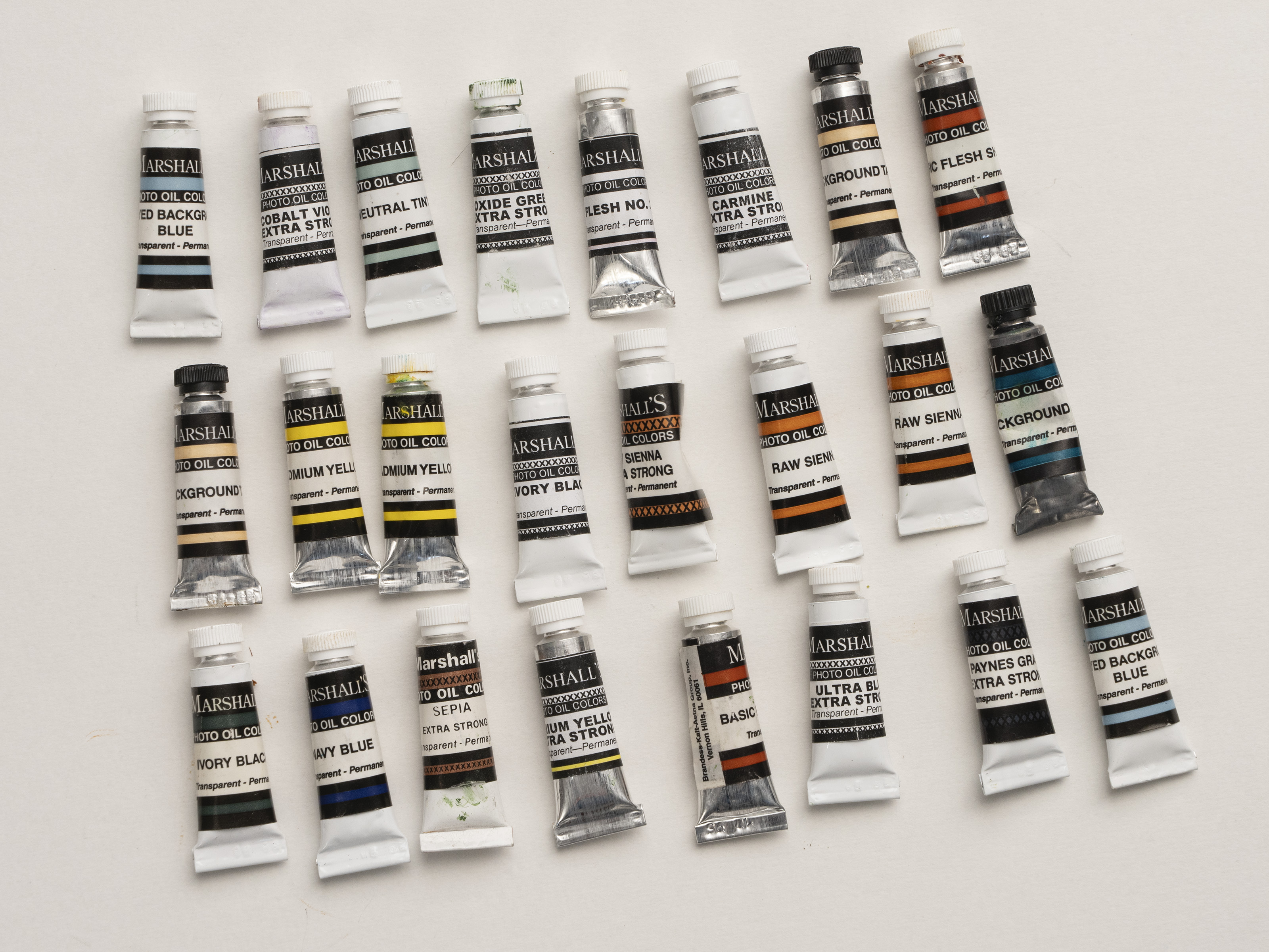 A new set of 24 oils. I opened 8 of the tubes, with only a tiny amount, if any used. I was exploring hand colored silver gelatin, and inkjet prints. Shortly after I bought this kit, I stopped shooting black and white. This is a really nice set of transparent oils. The tubes measure 2” top to bottom. Shipping is USPS and will be actual charges.