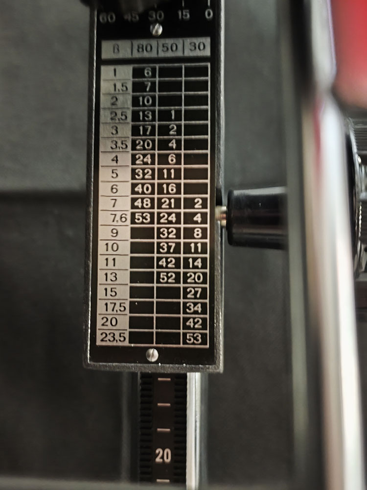 One thing on the Meopta Opemus 6 that I haven't fathomed yet is the graduated numerical table on the block of the elevation mechanism on the enlarger itself. I have no idea what it is.