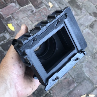 This is a 6x6 to 6x9 3D printed camera body configured for a 105mm lens and Graflok back accessories. I also bought the viewfinder set up for 105mm 6x9. The lens cone and focusing scales are all there. Altogether on their website or looks like this configuration is over $150.