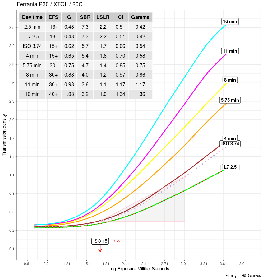 One other thing that I think can be useful to photographers is seeing how particular curves of interest, such as for a "normal" scene luminance or "normal" in the sense of CI, fit into the family of curves. Here, my program synthesized two extra curves, as an example, one, marked "L7" and one marked "ISO." By coincidence, the L7 and the 2.5 minute curves coincide (sorry about the pun), except that the 2.5 minute curve is actual, whereas the "L7" curve is synthetic. Nevertheless, they share the same values of all the parameters of interest and the same overall tonality. This is possible because of the statistical model of the characteristic curve used here. It fits the data quite well. The ISO curve was generated the same way. The synthetic curves are plotted with dotted lines.
