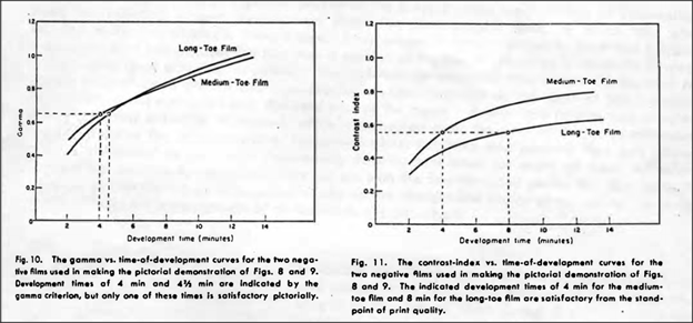 Taking this as step further, the next example has gamma – time curves and contrast index – time curves (an average gradient method) for a medium toed and long toed emulsion. The development times for two films in the gamma – time curve that will produce films with the same gamma have relatively similar development times. In fact, the gammas are rather closely related throughout development. In stark contract is are the contrast index curves derived from the same family of curves as the gamma – time curve. It shows a far greater difference in development time need to produced negatives with the same contrast index. The paper also includes pictorial examples illustrating the differences.