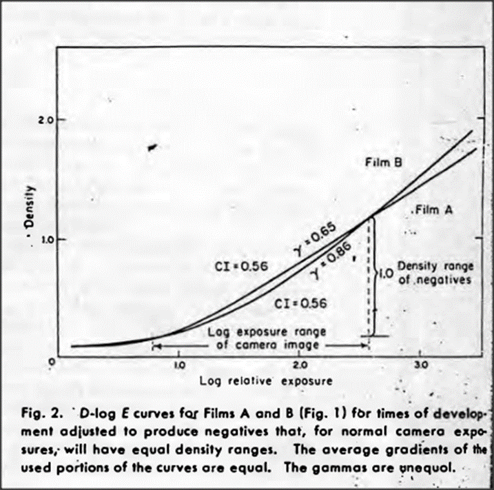While most manufacturers use some form of average gradient today, I believe that taking a look at gamma will help to emphasize the importance of using the method of interpreting a film curve that best comports to reality and real world results. The premise on gamma in C.J. Niederpruem, C.N. Nelson, and J.A.C. Yule, Contrast Index, Photographic Science and Engineering, Vol 10, 1966, is that gamma “is not always an appropriate basis for selecting proper development times for photographic for photographic films. It often fails when applied to films for which the D-log E curve have unusually long or unusually short toes because it does not take into account the fact that a portion of the toe of the curve is normally involved in the exposure of a typical negative.”
