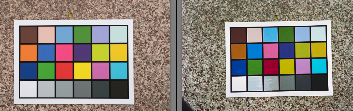 Two shots of the same colour target, digital camera on the left, Kodak vision 3 250D on the right. Cine film DSLR 'scanned' and inverted using negative lab pro and all of the 'auto' settings (no manual colour correction). The patch colours in the digital photo are more accurate but I think the ground is a little too red, I kinda prefer the cine film to be honest.