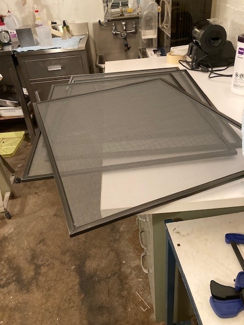 My wash regimen requires a partial tear down and cleaning of 3 trays then a refill with clean water and HCA respectively. I squeegee in a clean 20x24 tray. Drying screens simply spread all over the floor on top of boxes. I need to cobble together a drying rack. (It annoys me when hobbies require further projects). 2 pieces of plywood with some dadoed channels and a cross-brace of some type is all I need. My tablessaw and some other tools are languishing on a job site right now.