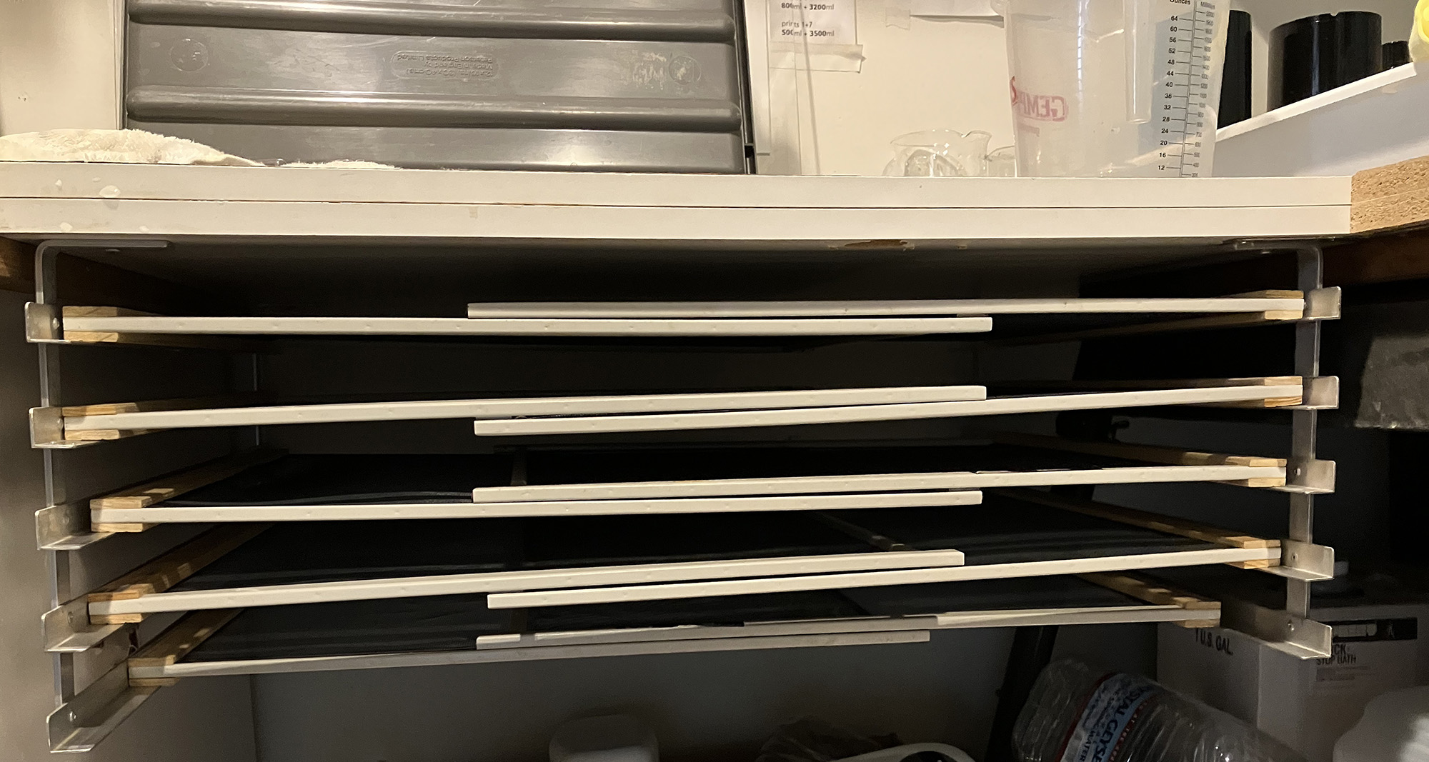 Stacking them on a work table works fine too. It all depends on your space available. In my case the only space i have is under my sink...which is far from ideal. After all though, the topic was "minimum equipment"( "requirements for a knock-down darkroom er, printing station? ). & in my darkrooms, a rack has been far down the priority list.