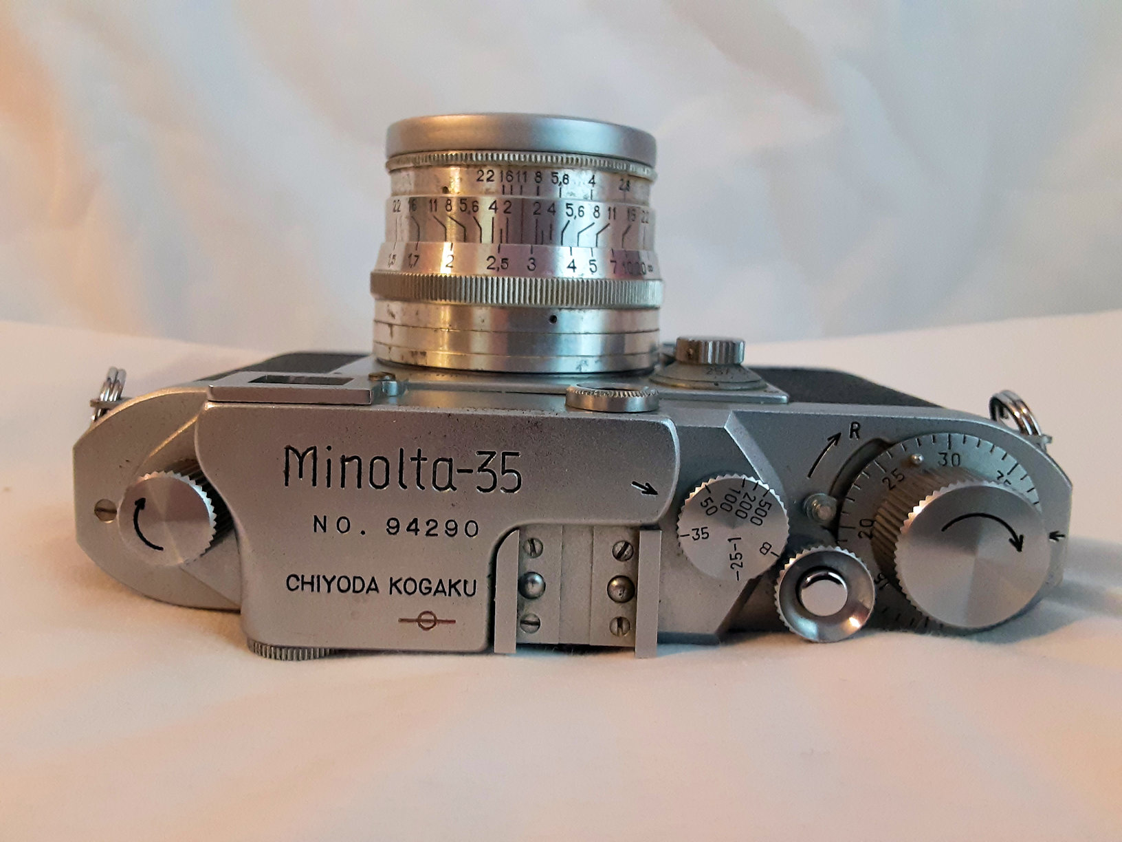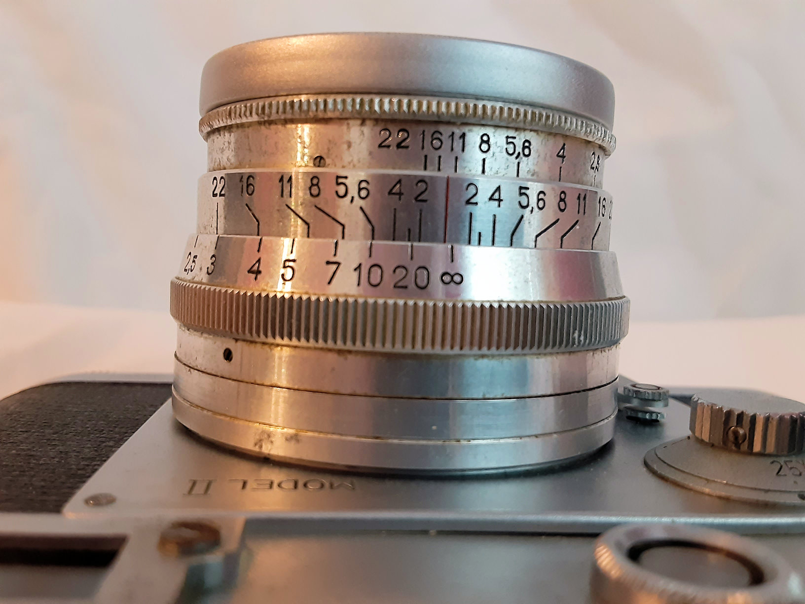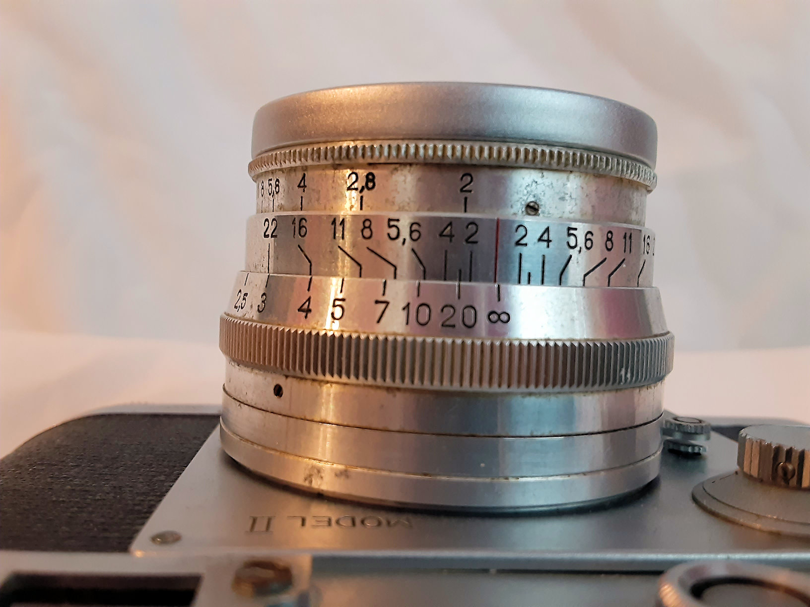 Lens is free of fungus, haze , has small dusts, few light scratches. Two photos of the lens show the f scale out of adjustment. Not sure if there is a easy way to correct that or not.