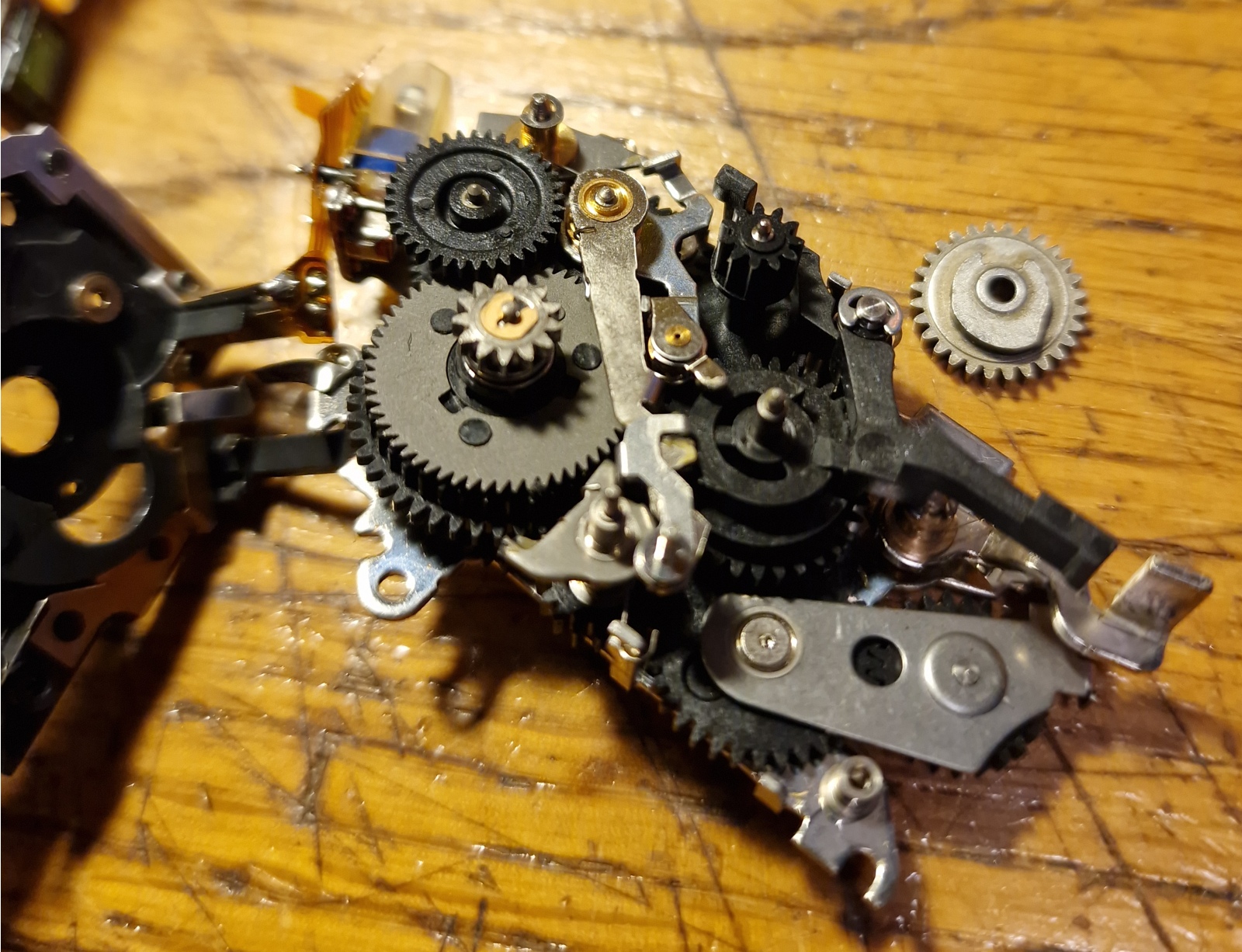 Winding mechanism taken out of the base, and the side of the mirror box with the aperture control mechanism removed. Unfortunately i've got no better photos of the electronics since I removed them with scissors. It was the aperture mechanism I was curious to see. Also all of this except for some potentially useful ancillaries went right into the bin since i'm running outta space for storing camera giblets.
