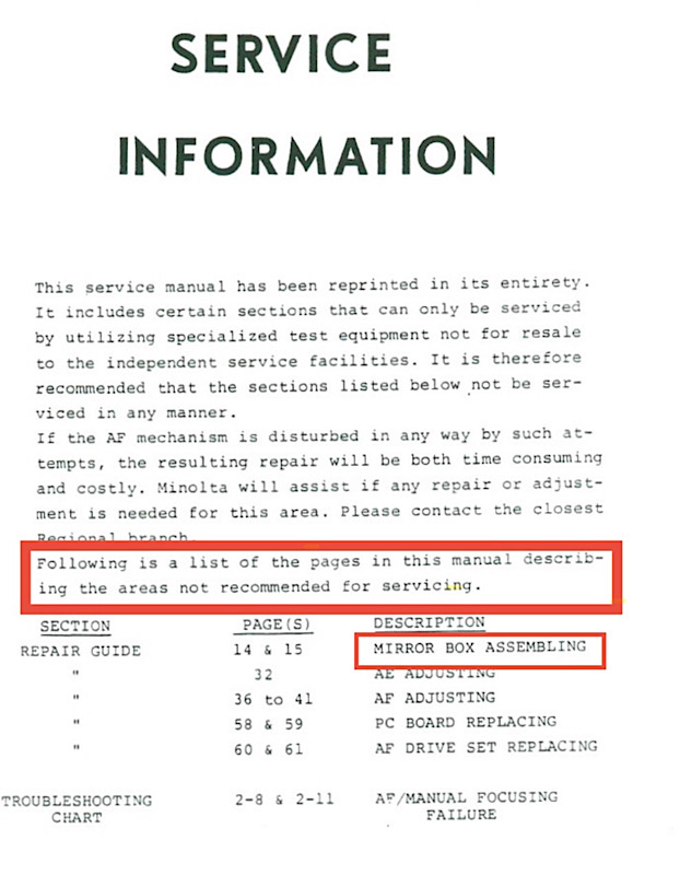 Yeah I figure that stuff means it involves special fixtures, gauges, and electronic/ computerized testing devices that wont exist outside of a Minolta service center and were either scrapped or in need of service themselves by this point. The pages it points to includes stuff like some I/O tester for the exposure and AF measurements, along with various charts and attachments.