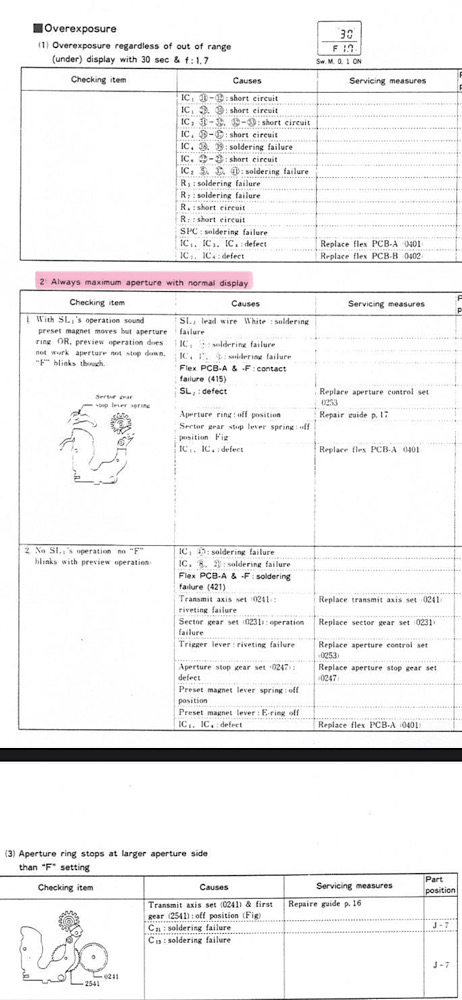 Part 2 "no F blinks" is probably for failures where the aperture mechanism works enough to spin the encoder disc but not later stuff and I don't think they're likely part of the common aperture problem.
