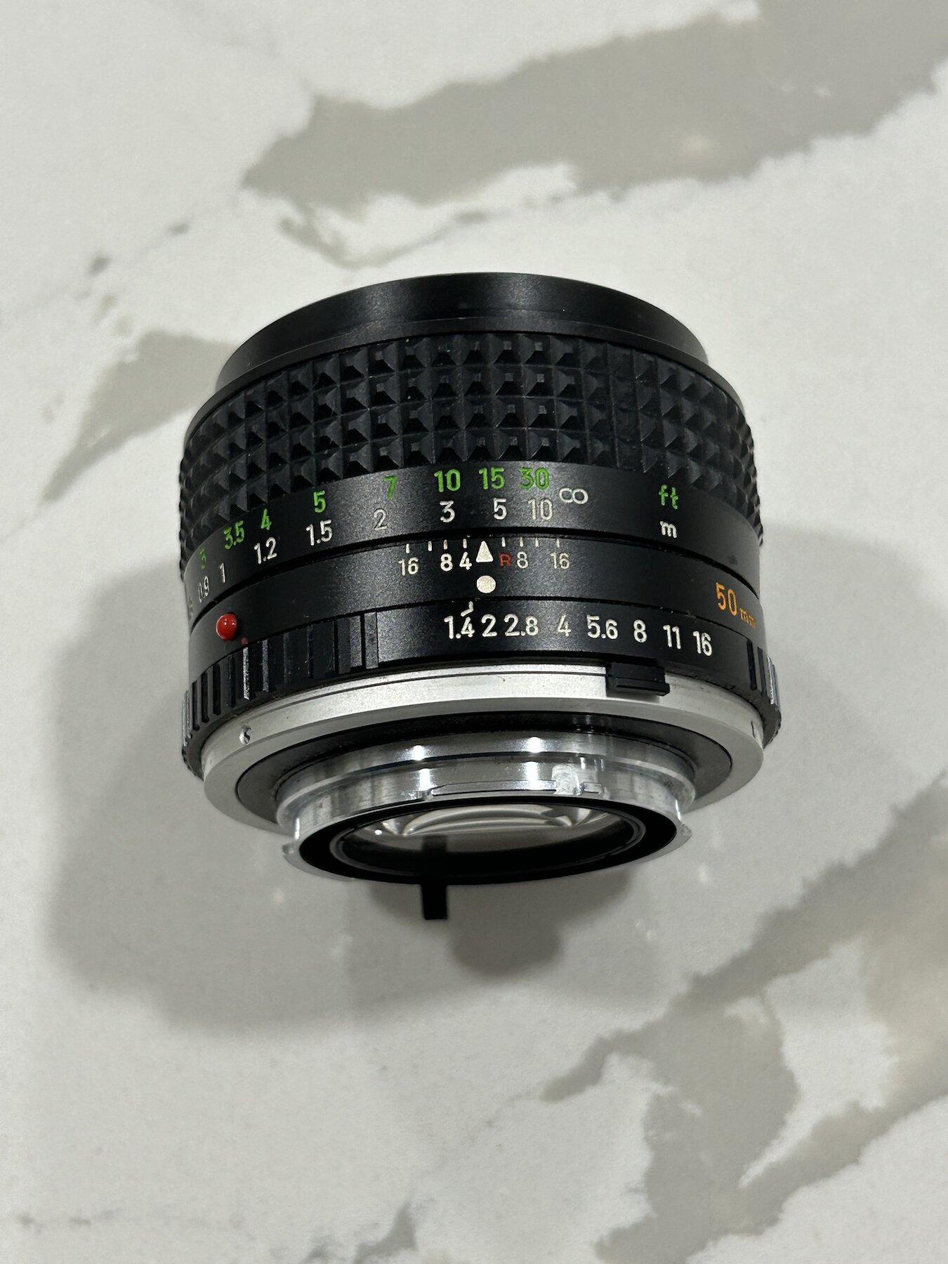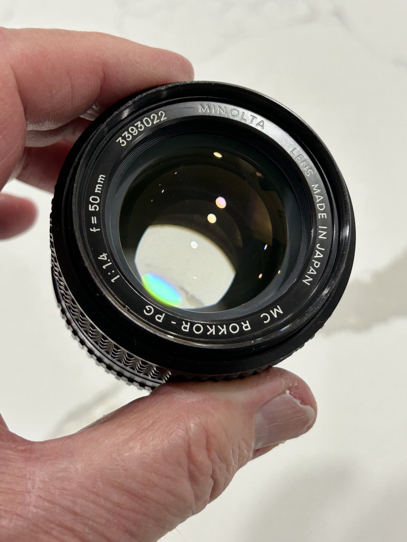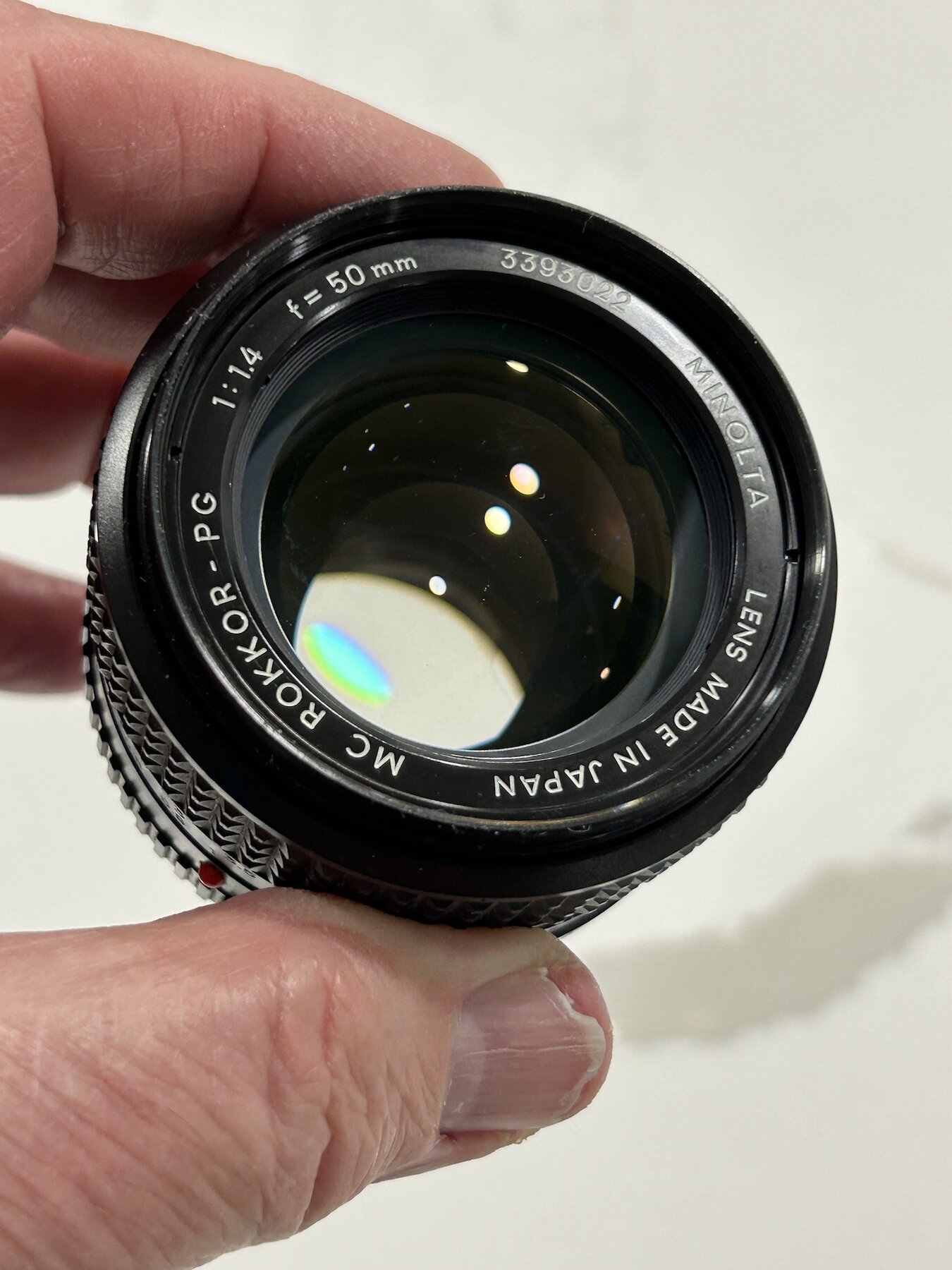 I am selling a Minolta MC Rokkor-PG 50mm F1.4 Lens for Minolta MD mount in excellent condition. The glass is clean and clear, the focus is smooth, the auto iris action correct ("snappy" as they say). This beautiful lens has seen very little use. Sold as shown with a skylight filter (also in good condition) to protect the front. I do not have a rear cap, but I will pack the lens carefully to protect the rear part when shipped.