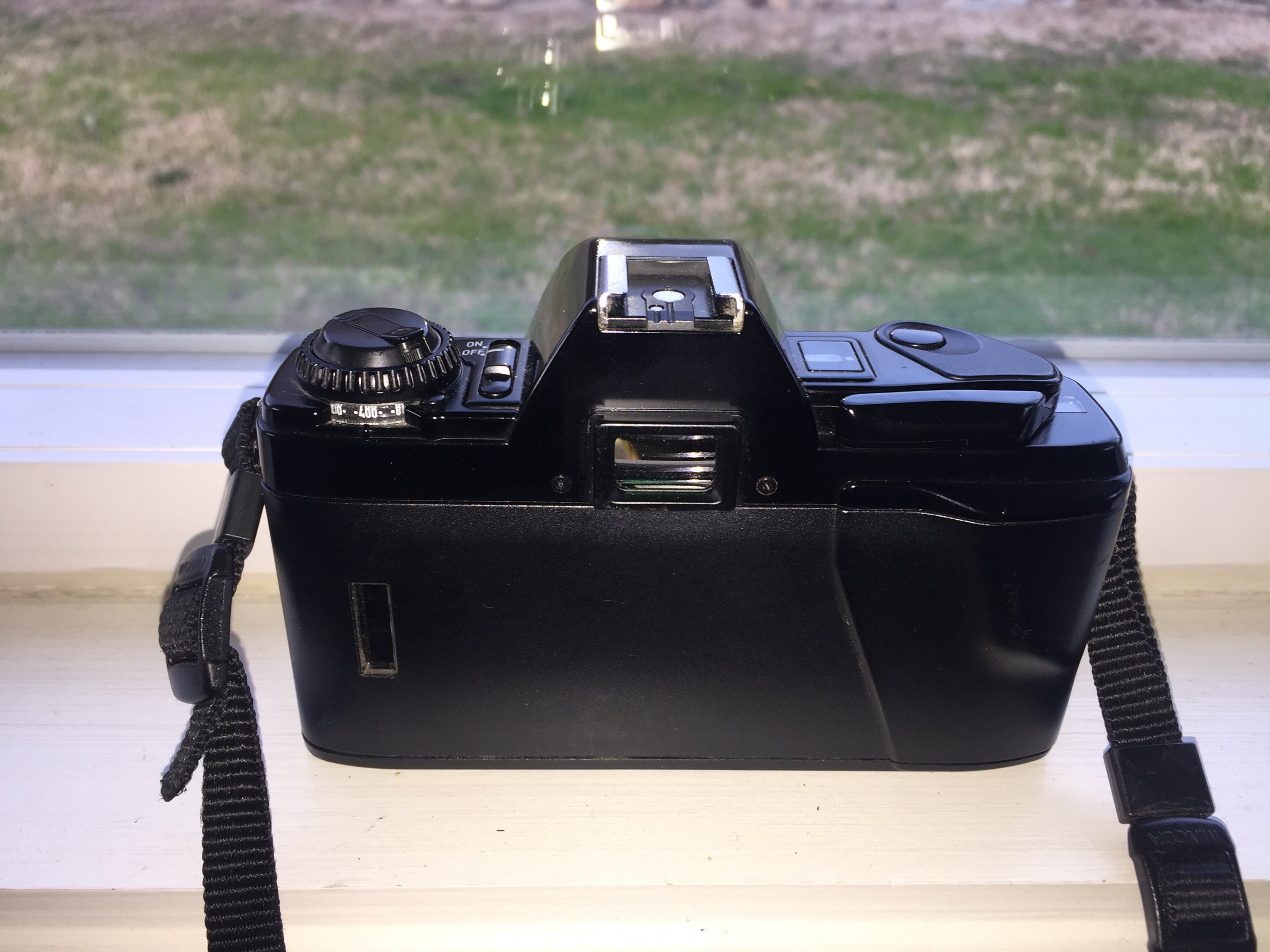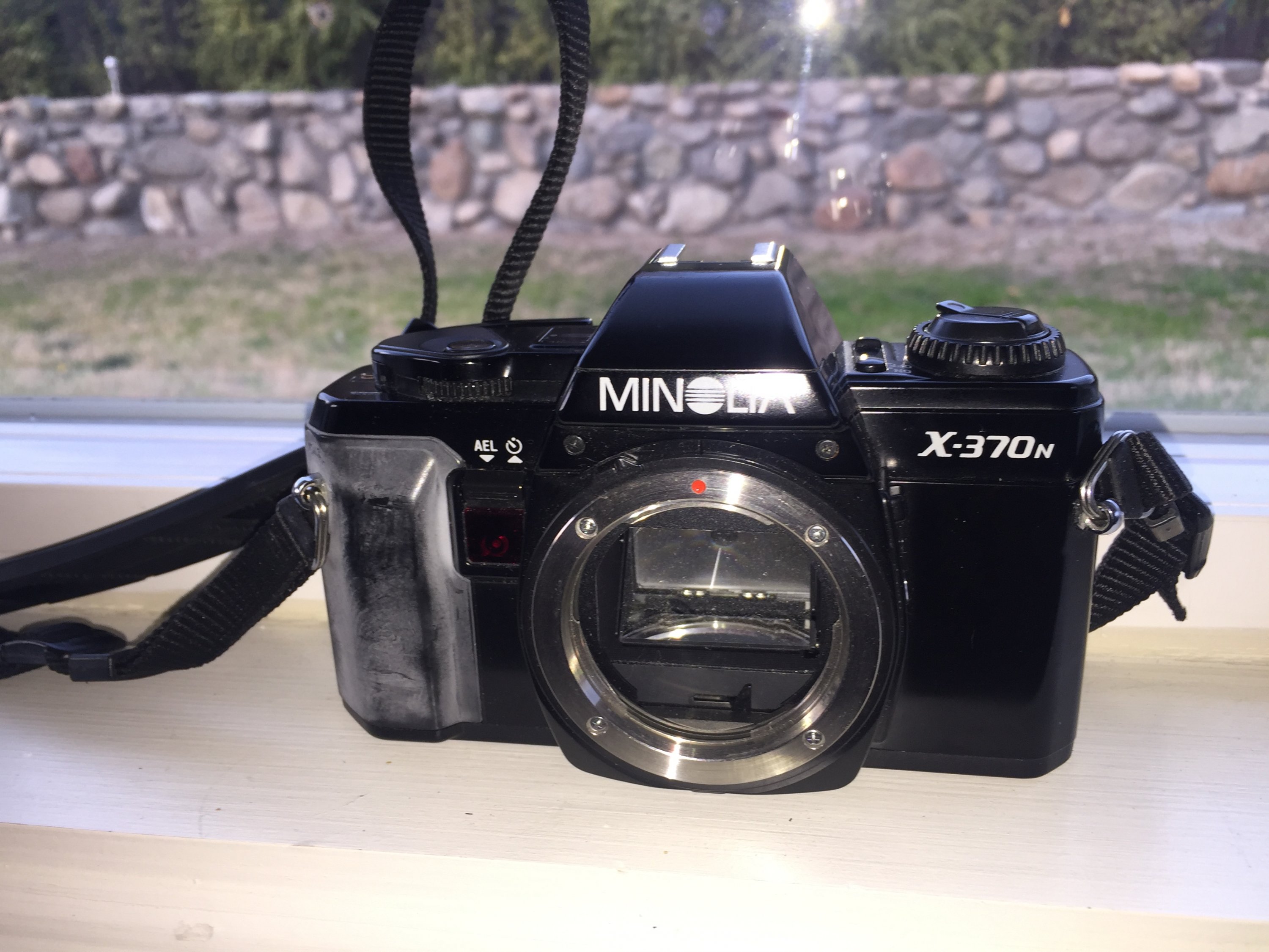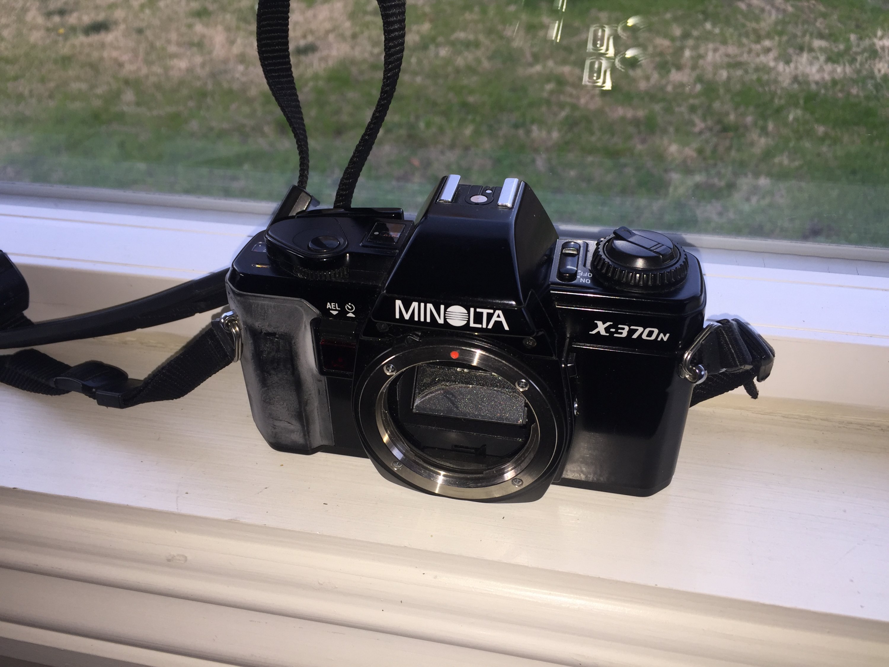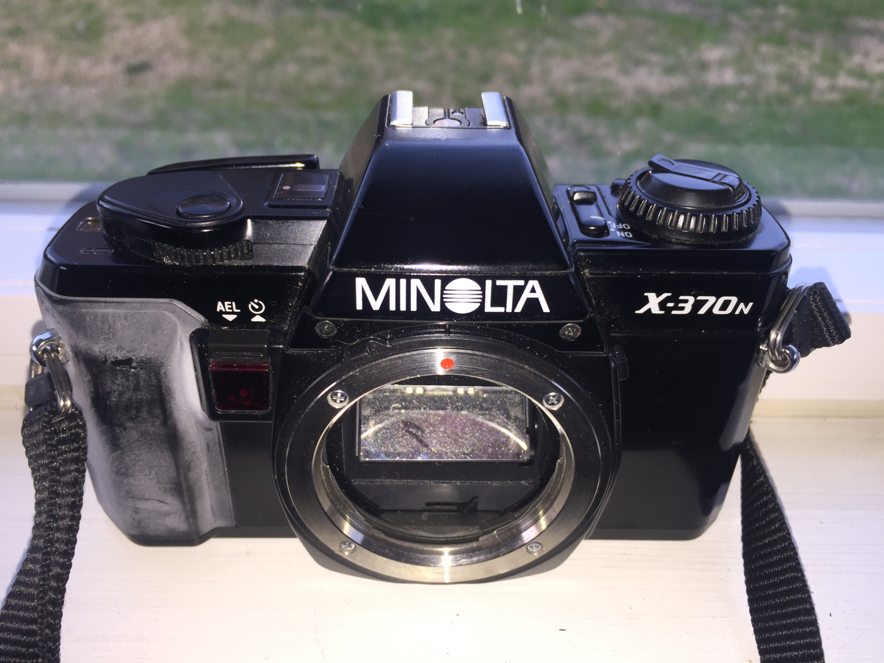 I am selling a lightly used Minolta X-370n Minolta MD mount 35mm SLR body. I acquired this with some other items a few years ago and I have never used it. It seems to have seen only light use overall and the condition is excellent. I haven't shot film with it, but it powers up and seems to set exposure beautifully when loaded with LR44 batteries (not included, but inexpensive and widely available).