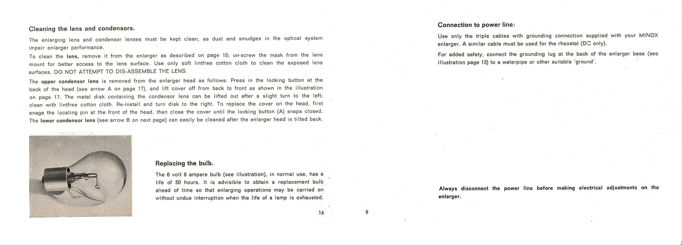 I know of people that tried to use a car headlamp bulb, but it left a shadow of the filament on the print. The Minox enlarger is a very specialised item, developed for the tiny 8x11 mm negative - approx. 1/10 th size of a 35 mm negative. It uses a special 15mm lens wheras 35mm enlargers tend to use a 50 mm lens. I think Leitz manufactured a 25mm enlarger lens but have not seen one. With the Minox negative you would need a long distance from the lens to the paper using a 50mm lens. Durst used to make a carrier for 8x11 film but I have not seen one. Minox reckon the lamp only has a life of 50 hours. It has been suggested to use a 12v LED lamp fitted into the housing but I do not know what wattage to try.