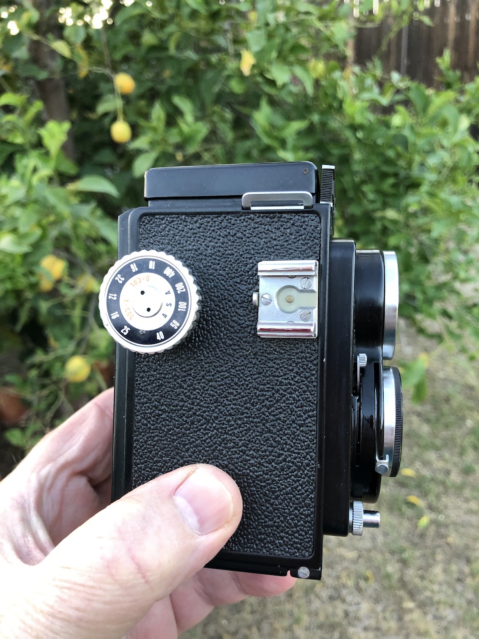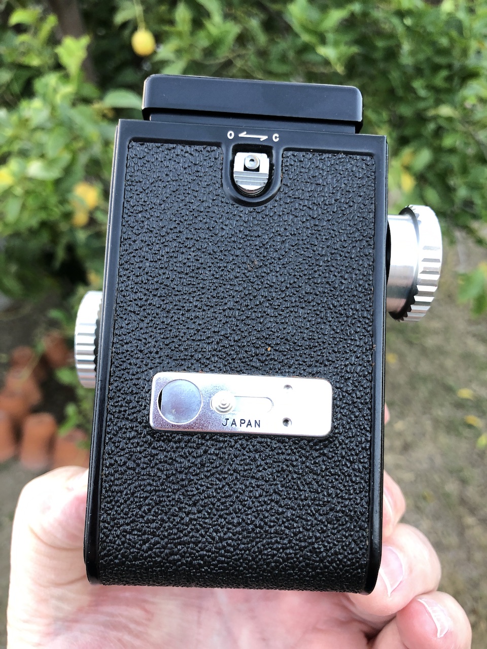 This is a minty Ricoh Super 44 Twin Lens Reflex which I recently had CLA'd at Whilton Camera Service in San Gabriel. The condition is exceptional. This remarkably compact and light camera produces 4cm X 4cm negatives on 127 film. One can easily find 127 film at B&H Photo and a variety of other venues in C41, black and white, Cinestill, and even E6 emulsions (in fact it seems to be making a comeback!). Everything is correct on this camera except the self timer which hangs some, or all of the time (it can be helped to complete its action with a gentle nudge or two).