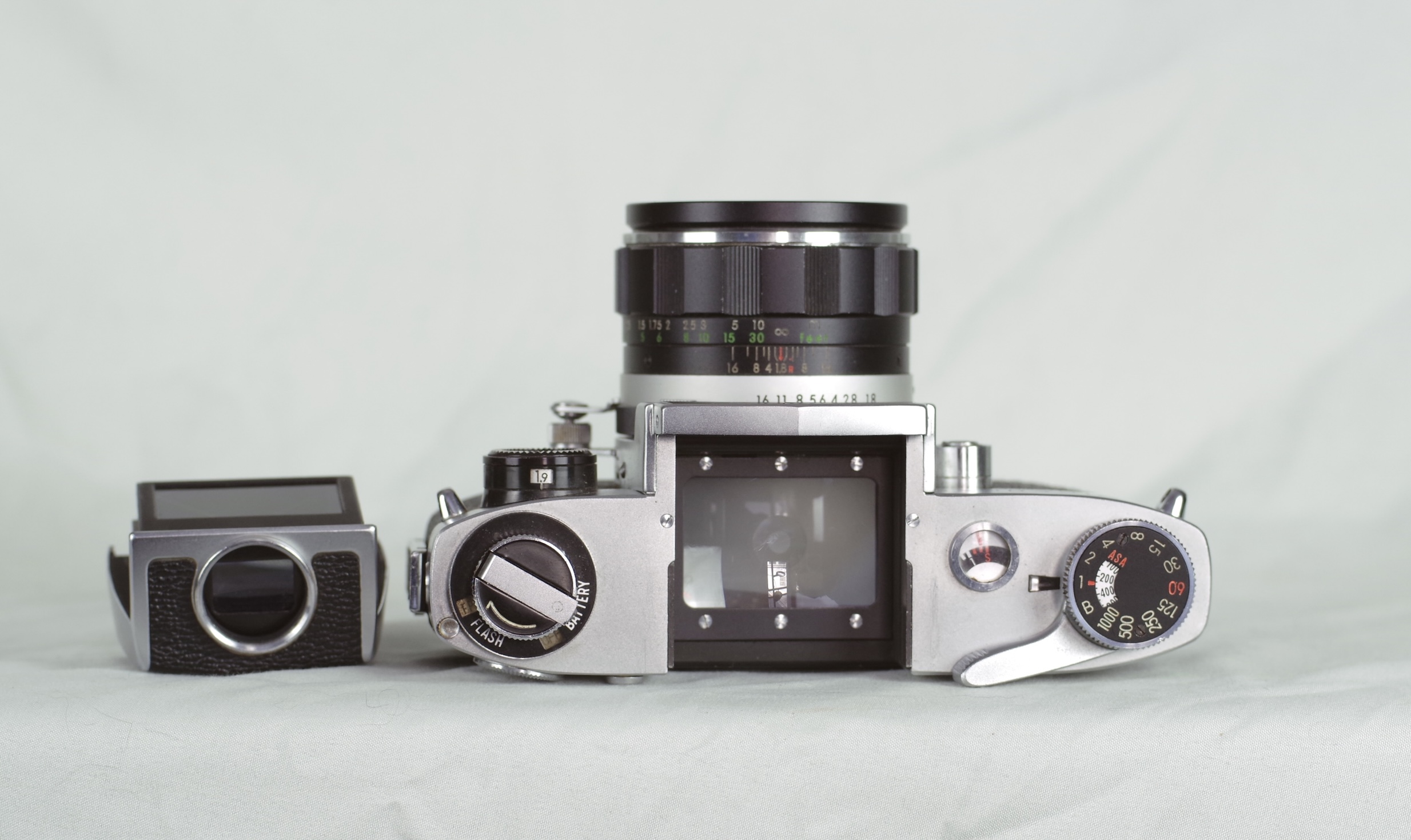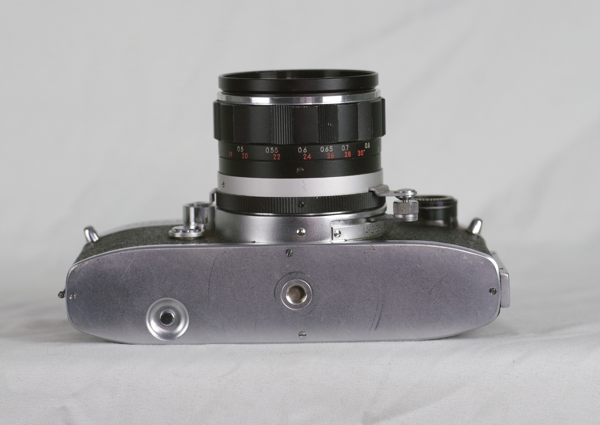 Camera is in good shape, cosmetically shows some wear. Slow shutter speeds sound accurate, the lens has no fungus, some dust and minor marks on the front element. The meter doesn't work.