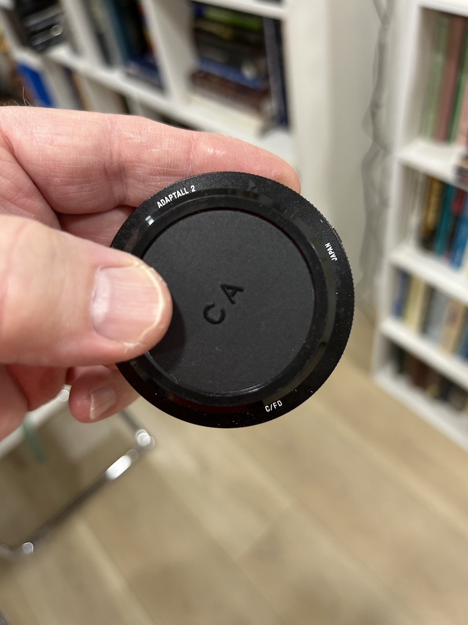 Adaptall 2 Adapter for Canon FD - Presumably made by Tamron, but unmarked. Looks new. Sold with rear Canon FD fit cap. Price: $8